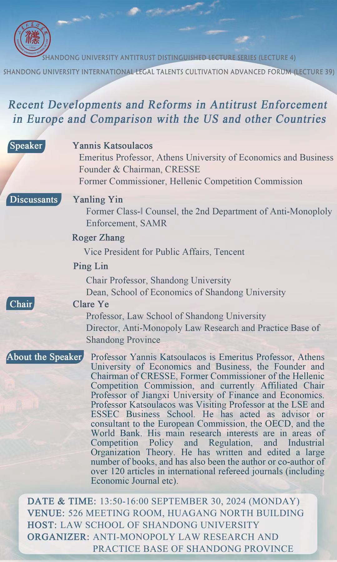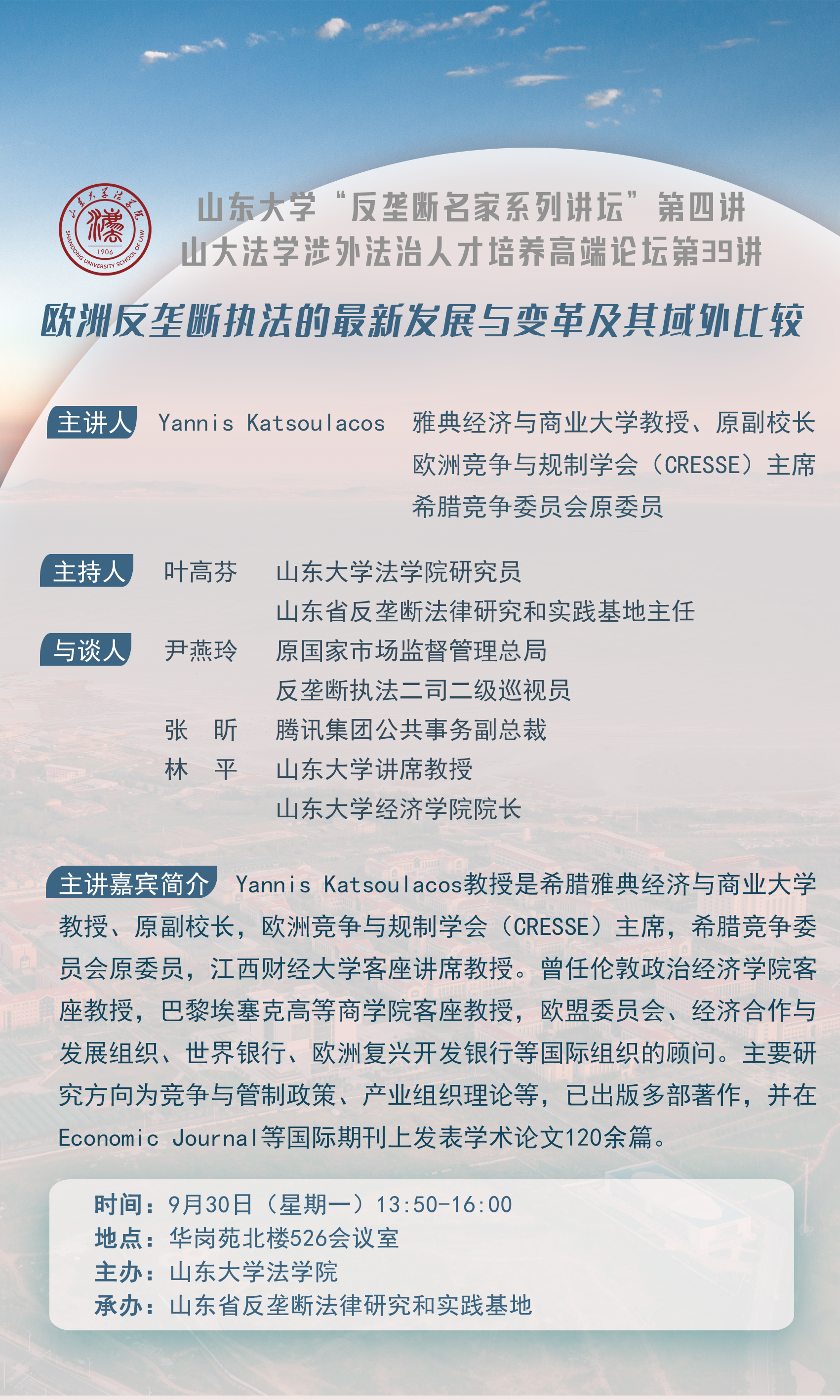 讲座预告|山东大学“反垄断名家系列讲坛”第四讲:欧洲反垄断执法的最新发展与变革及其域外比较