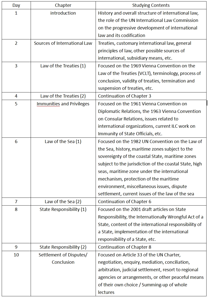 学生将学习国际法的一般理论及其在国际关系中的应用。由于时间限制,本课程无法包含国际法的所有内容,但它将涵盖现代国际法最重要的领域。同时朴教授在课程中将作为前联合国国际法委员会(ILC)成员针对ILC所做的相关工作进行分析。