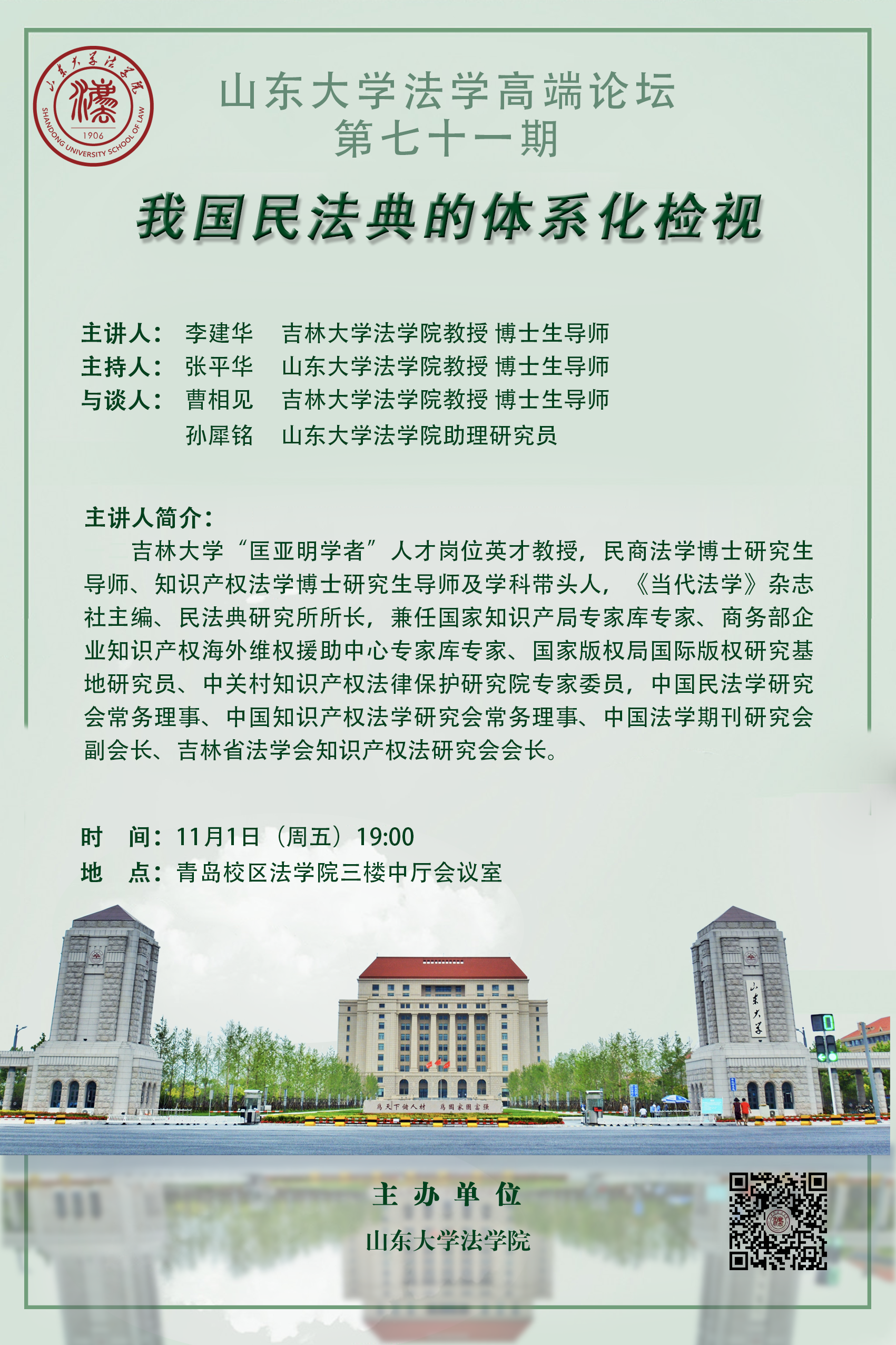 讲座预告|山东大学法学高端论坛第七十一期:我国民法典的体系化检视