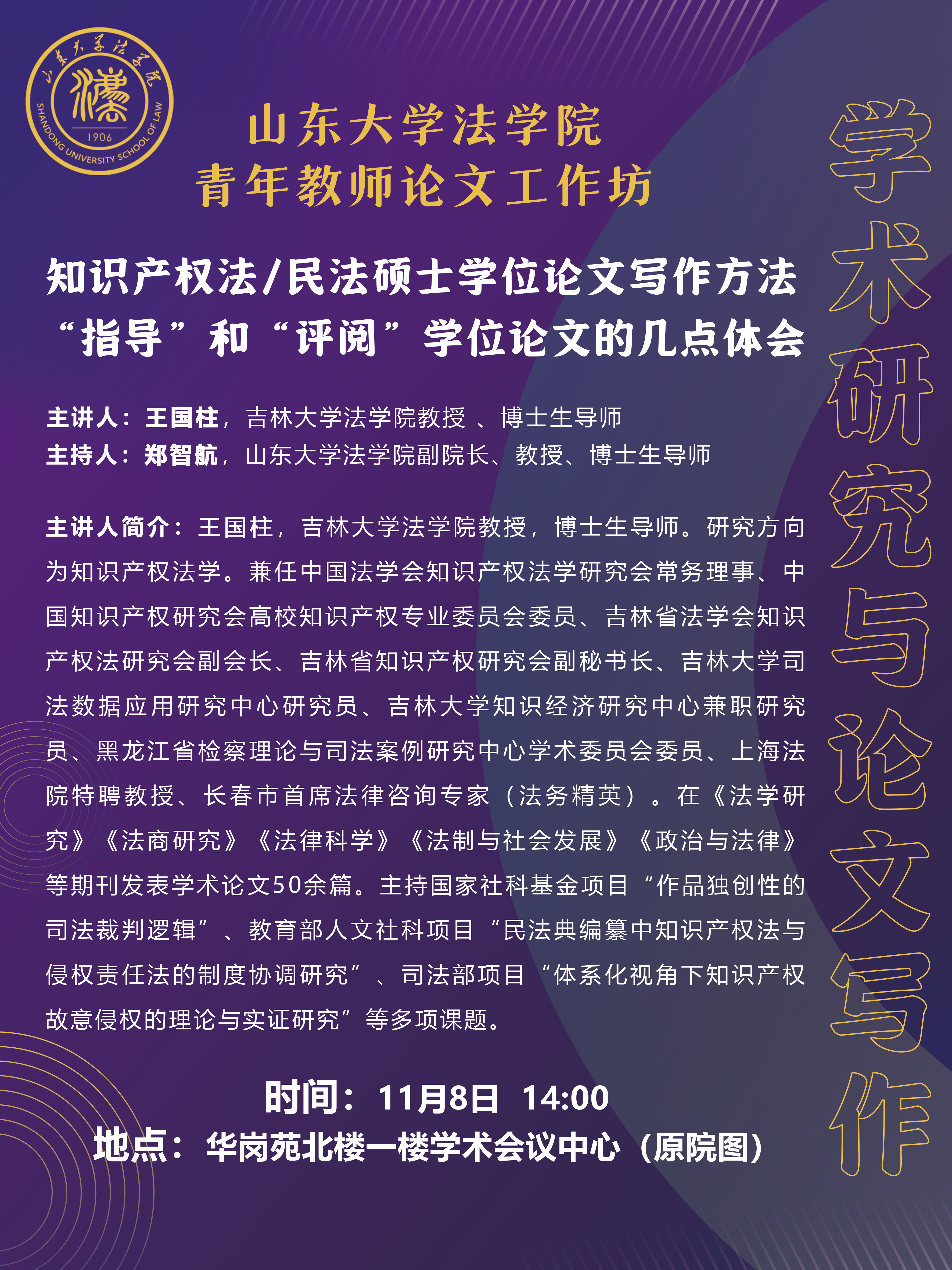 讲座预告 | 金沙集团1862cc成色青年教师论文工作坊:知识产权法/民法硕士学位论文写作方法“指导”和“评阅”学位论文的几点体会