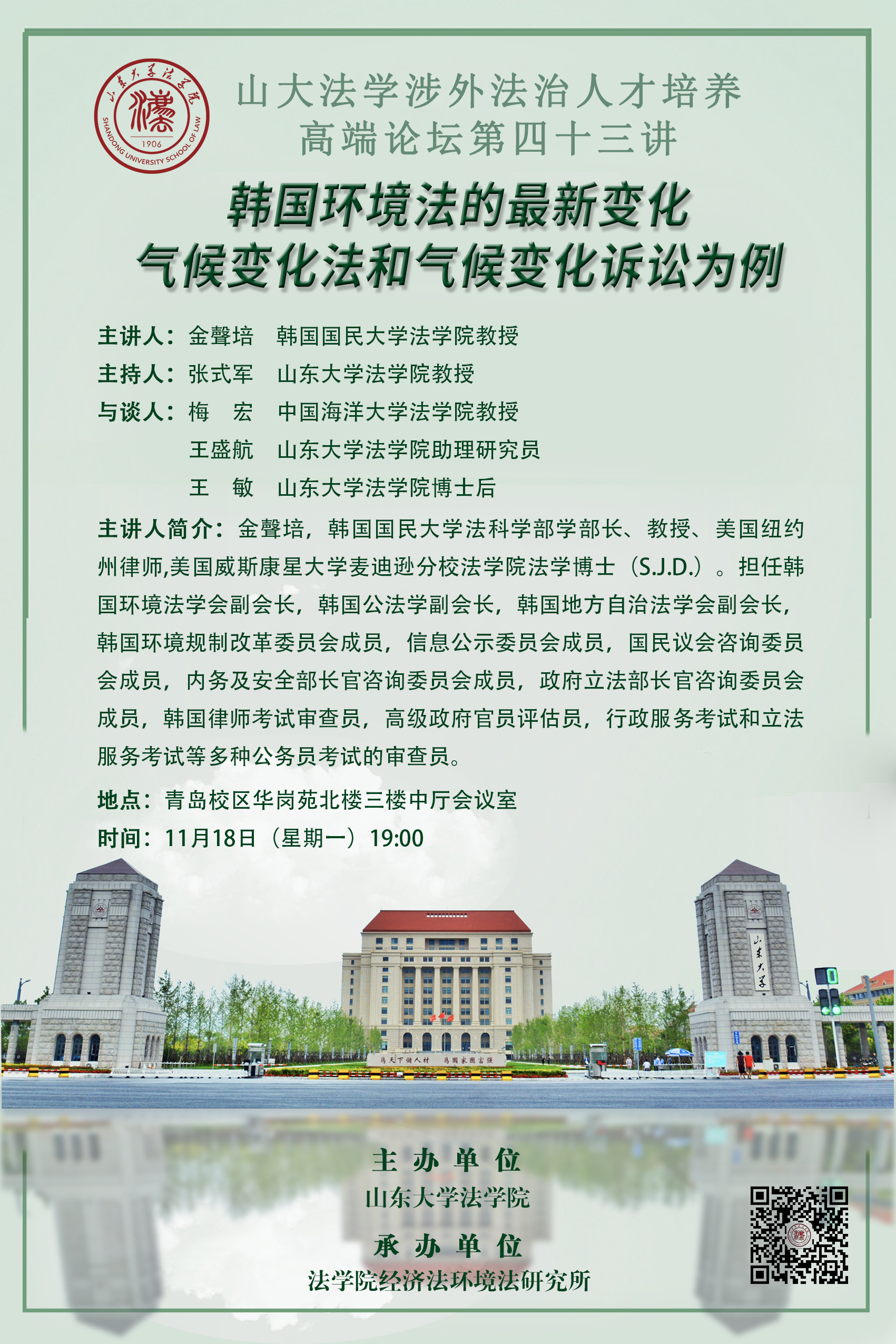 讲座预告 | 山东大学涉外法治人才培养高端论坛第四十三讲:韩国环境法的最新变化——气候变化法和气候变化诉讼为例