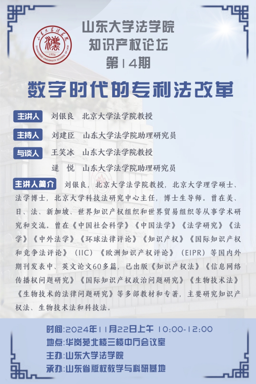 讲座预告|金沙集团1862cc成色知识产权论坛第14期:数字时代的专利法改革