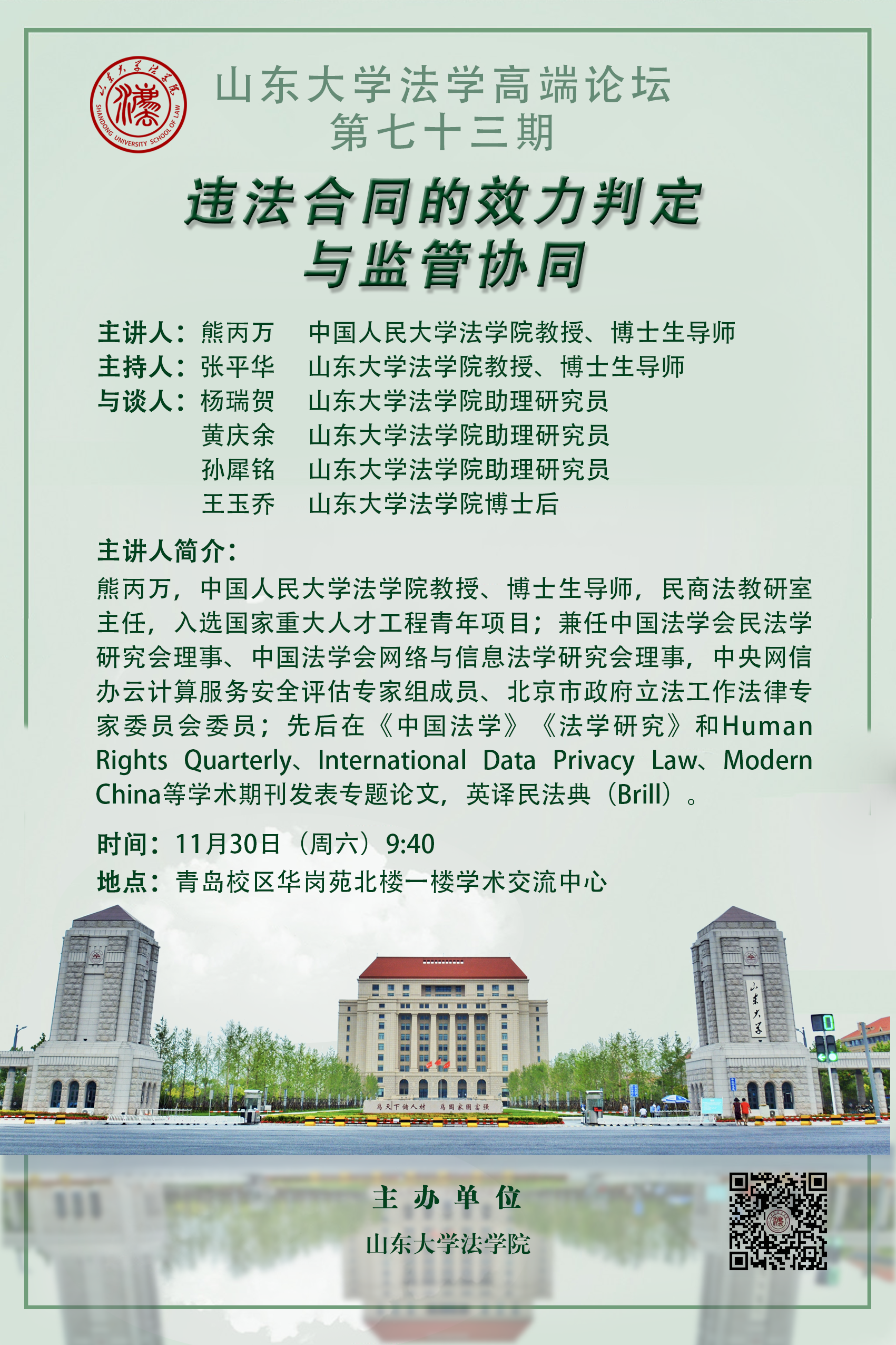 讲座预告 | 山东大学法学高端论坛第七十三期:违法合同的效力判定与监管协同