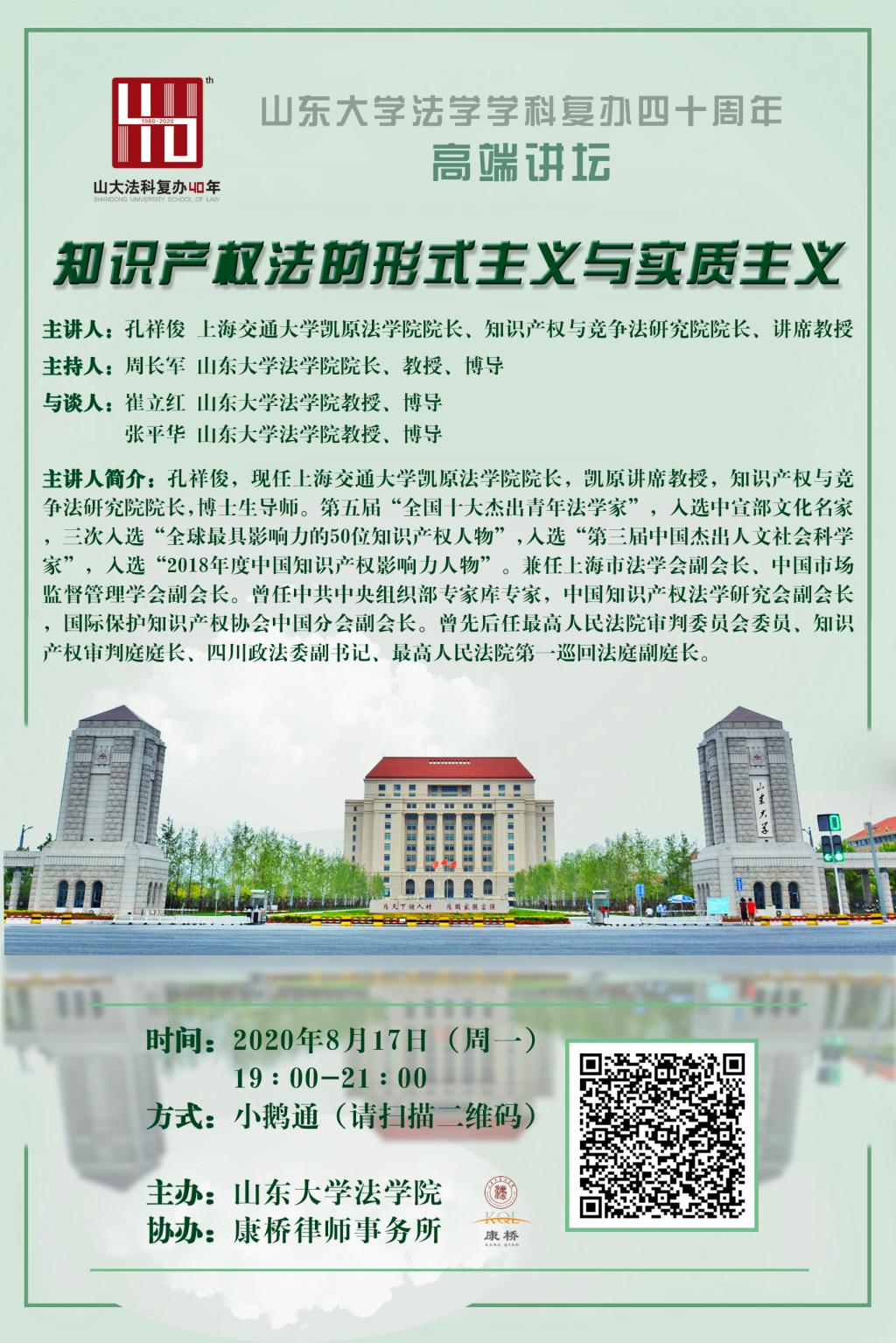 山东大学法学学科复办四十周年高端讲坛:知识产权法的形式主义与实质主义