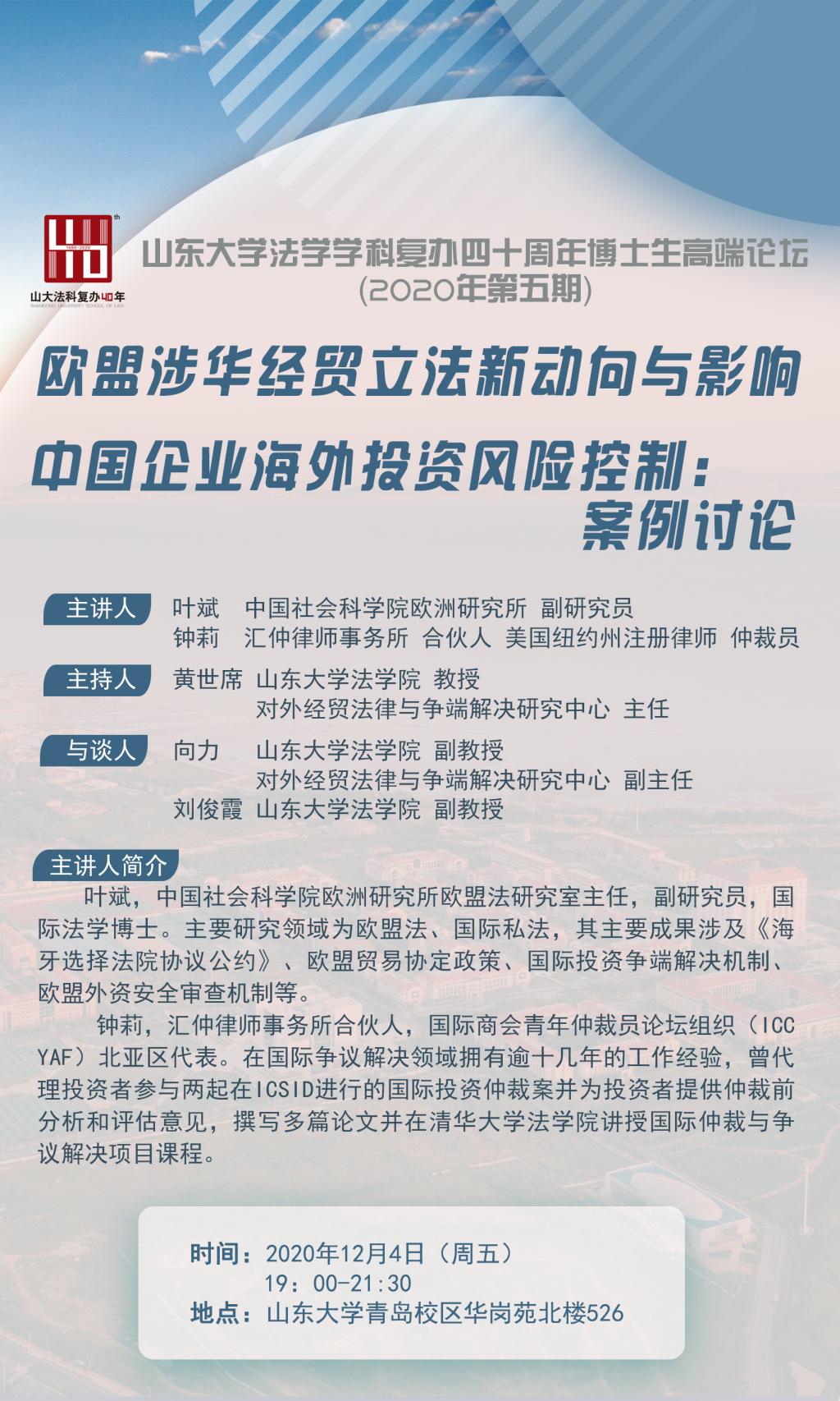 山东大学法学学科复办四十周年博士生高端讲坛(2020年第五期):欧盟涉华经贸立法新动向与影响 中国企业海外投资风险控制:案例讨论