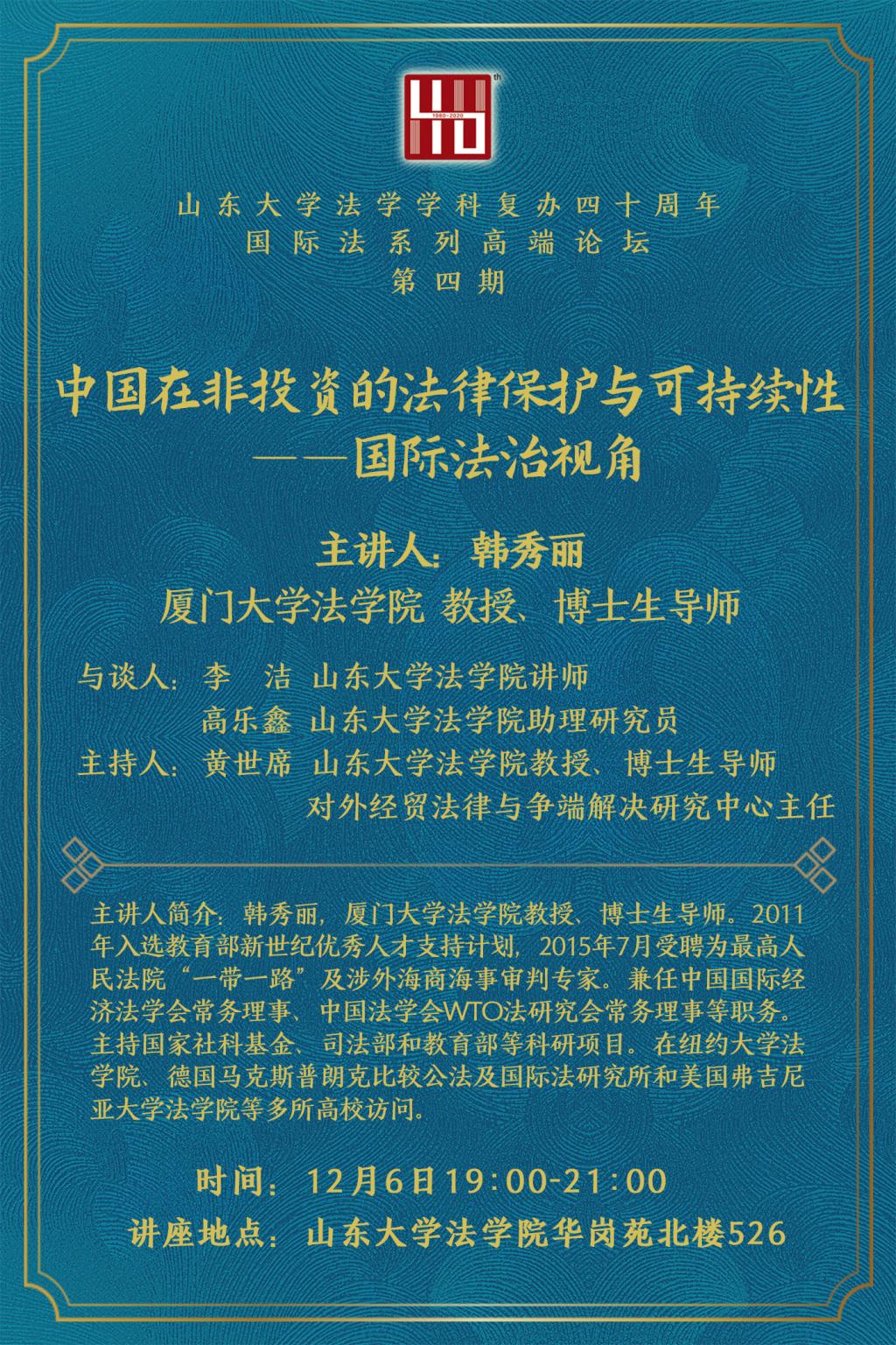 山东大学法学学科复办四十周年国际法系列高端论坛(第四期):中国在非投资的法律保护与可持续性——国际法治视角