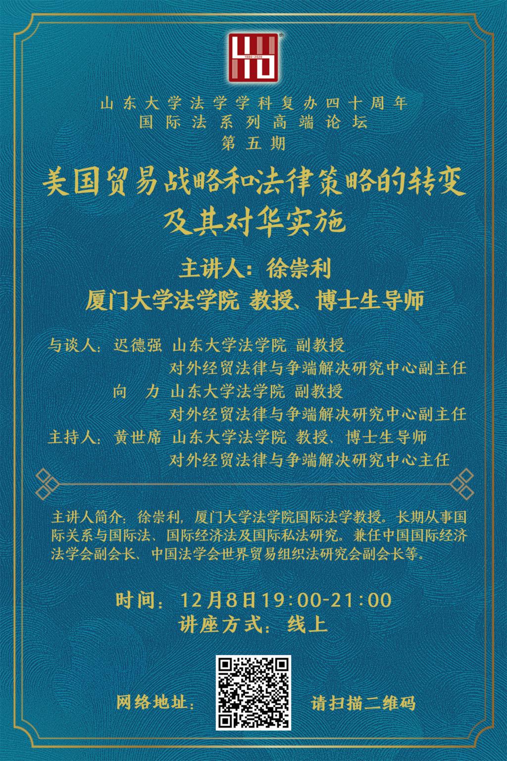 山东大学法学学科复办四十周年国际法系列高端论坛(第五期):美国贸易战略和法律策略的转变及其对华实施