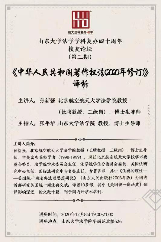 山东大学法学学科复办四十周年校友论坛(第二期):《中华人民共和国著作权法(2020年修订)》评析