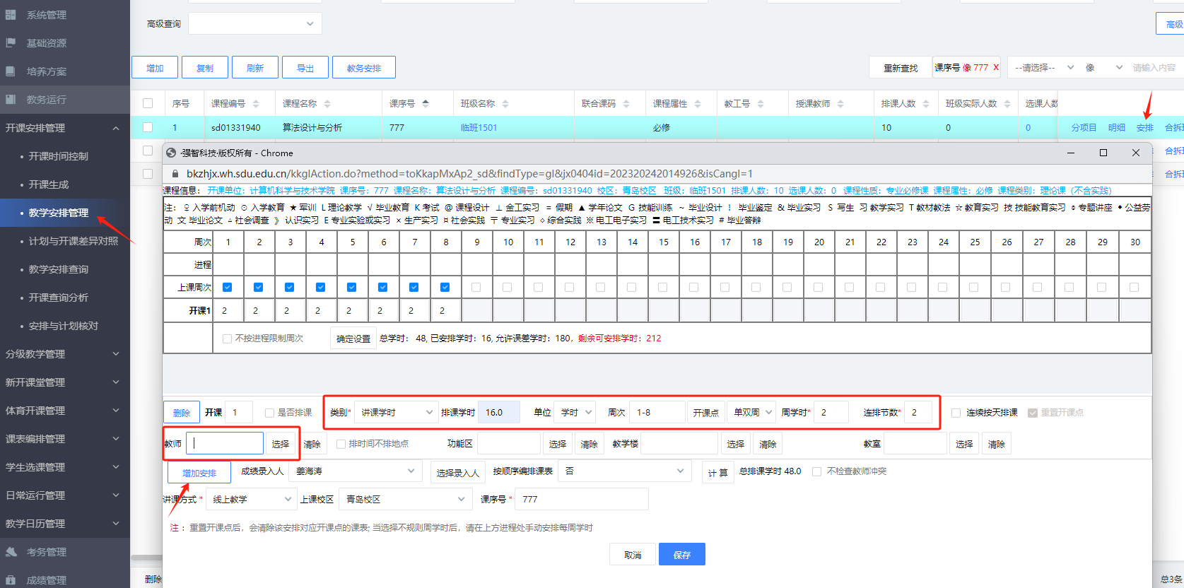 教务运行--学生选课管理--选课课程管理:‘增加课堂’,具体操作如图1。如果有777课程要增加,请通过增加课堂功能增加课程。如果需要做教学安排,在教学安排管理中正常增加开课点设置教学安排,具体操作如图2。
