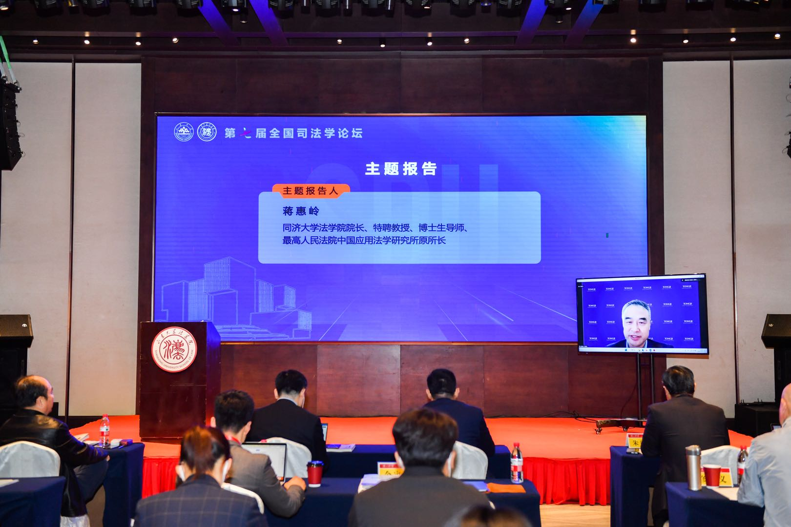 论坛主题报告阶段由中国政法大学数据法治研究院教授、最高人民法院中国应用法学研究所原副所长范明志教授主持。全国人大宪法和法律委员会副主任委员、最高人民法院原副院长江必新做了题为《中国式法治现代化与司法改革》的发言,从四方面谈了自己的观点:一、中国式法治存在一个现代化的问题。江教授从法治本身的含义、中国式法治的概念、建设法治中国的需要三个方面对其论证。二、司法改革与法治现代化之间的关系应理解为法治现代化包括司法现代化。司法是法治的中心环节,司法改革应同整个法治改革结合、统一、协同起来。三、公正权威高效的社会主义司法。核心除了要保证公正高效,还要对建设权威性的司法制度有特殊的制度安排。四、不能用法院独立来排斥法官独立,应采取相关配套制度来确保法官正确行使审判权,保证司法审判权不被滥用。