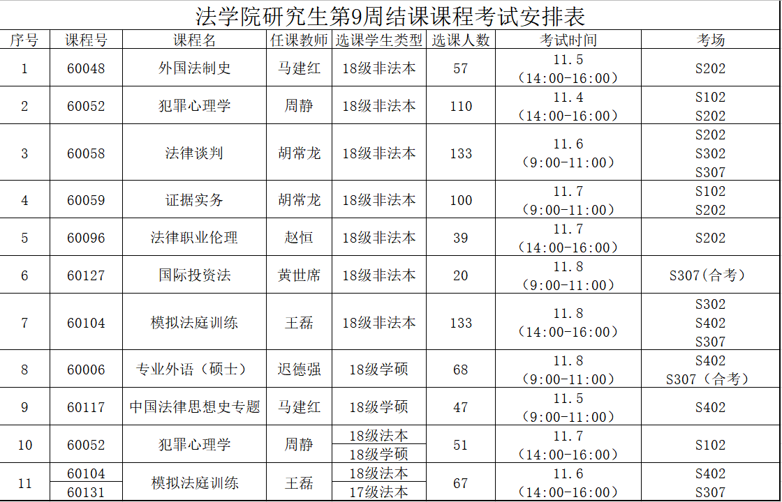 金沙集团1862cc成色2019-2020第一学期的研究生1-9周课程即将结束。按照计划,以“考试”作为结课考核形式的,考试会在第10周集中进行。现将安排公布如下(附件中有11门课程详细的选课名单及考场安排):