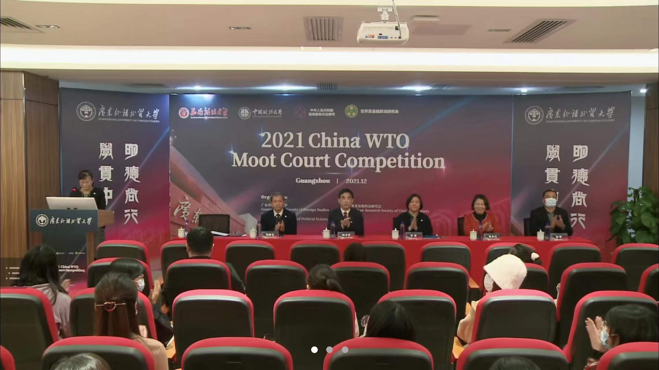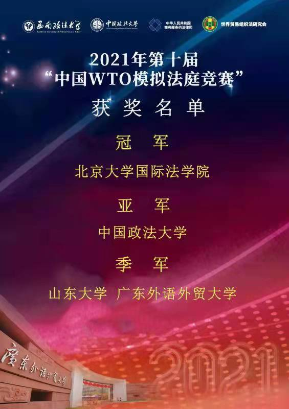 2021年12月11日,由中华人民共和国商务部条法司、中国法学会世贸组织法研究会、中国政法大学、西南政法大学联合主办,广东外语外贸大学承办的第十届“中国WTO模拟法庭竞赛”(China WTO Moot Court Competition)在新冠疫情防控形势趋紧的背景下,于线上隆重开幕。本届大赛历时两周,比赛官方语言为英文,分为书面和口头两个回合,出席口头回合比赛的专家组成员由原WTO上诉机构大法官、代表中国政府参与WTO争端解决案件的资深律师、商务部高级官员和高校教授组成。决赛最终于12月19日落下帷幕,共决出冠军1名、亚军1名、季军2名、一等奖4名、二等奖8名、三等奖8名以及优秀奖15名。