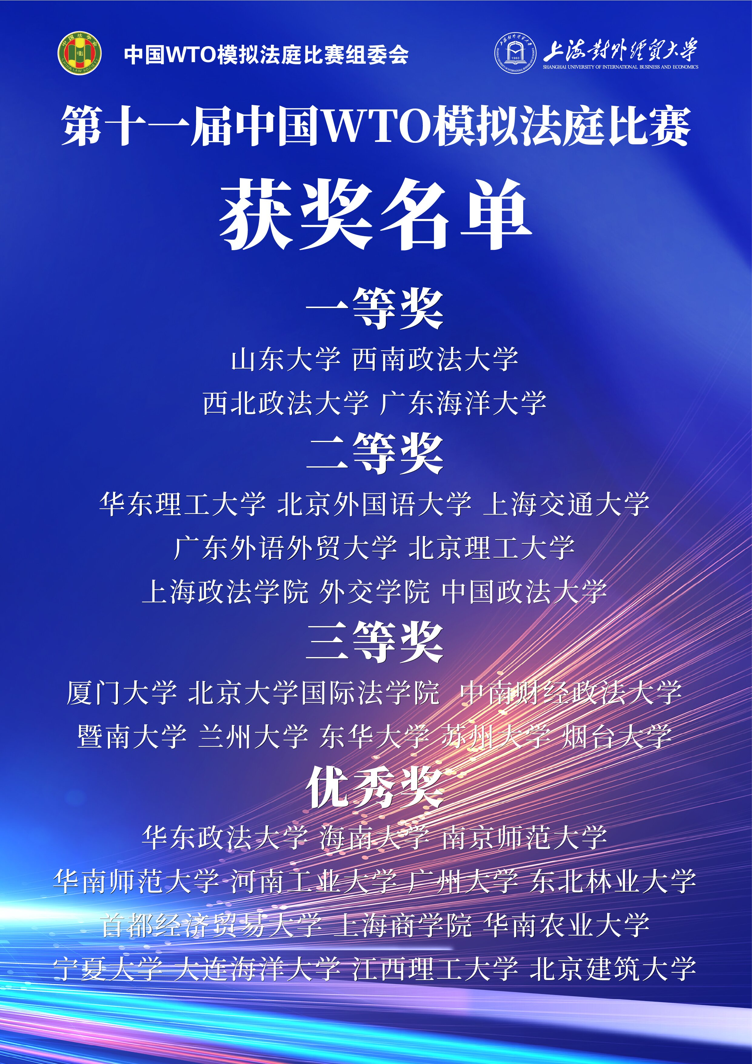 本届比赛官方语言为英文,分为书面和口头两个回合,出席口头回合比赛的专家组成员由原WTO上诉机构大法官、代表中国政府参与WTO争端解决案件的资深律师、商务部高级官员和高校教授组成。决赛最终于11月27日落下帷幕,共决出冠军1名、亚军1名、季军2名、一等奖4名、二等奖8名、三等奖8名以及优秀奖14名。