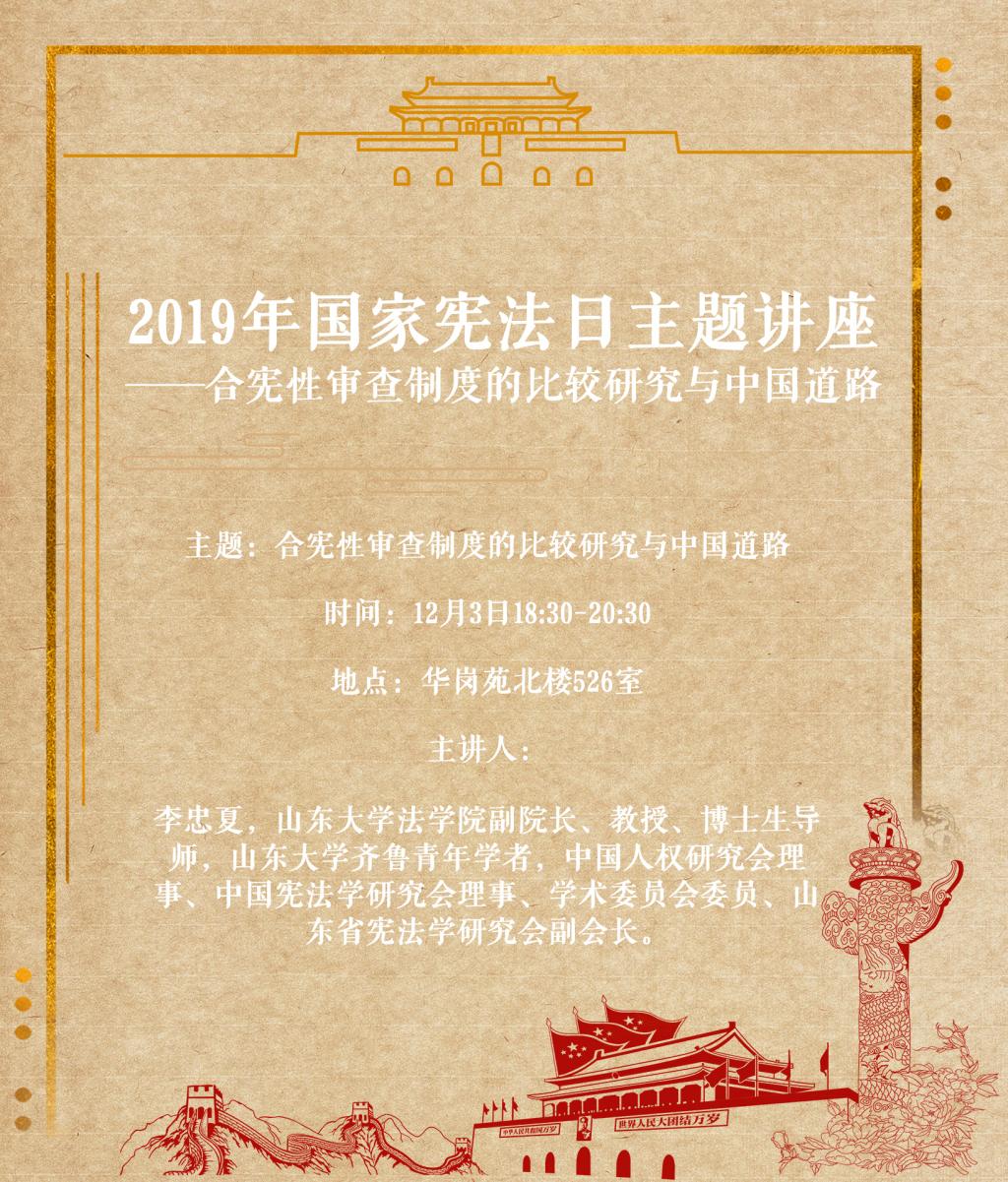 在第六个国家宪法日、第十九个“全国法制宣传日”来临之际,为宣传党的十九届四中全会精神,增强同学们的宪法意识,弘扬宪法精神,使大家更好地理解宪法实施,金沙集团1862cc成色学生会学术部特邀请金沙集团1862cc成色副院长李忠夏教授作合宪性审查制度的比较研究与中国道路的主题讲座。现将具体事宜通知如下: