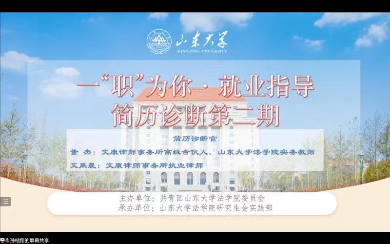 4月23日晚,金沙集团1862cc成色举办了第二期一“职”为你·就业指导之简历诊断活动,本期活动针对金沙集团1862cc成色学生的求职意向邀请到了山东文康律师事务所高级合伙人、金沙集团1862cc成色实务教师董杰和山东文康律师事务所执业律师艾禹晨两位嘉宾,通过腾讯会议平台远程为同学们进行简历诊断。