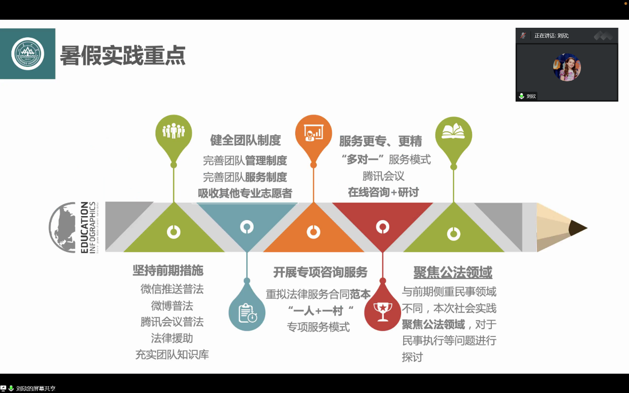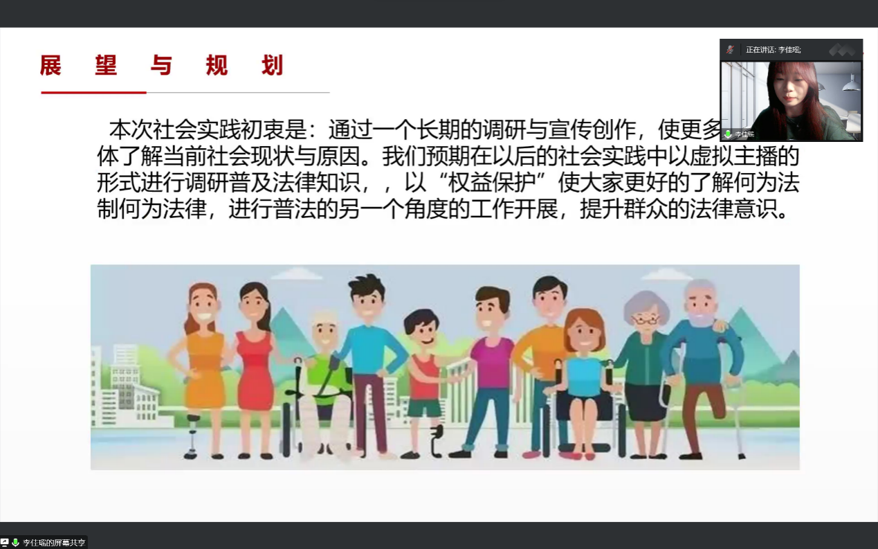 疫情常态化防控背景下,答辩会选择依托线上平台开展,各团队通过视频会议,轮流共享屏幕进行答辩。在主持人的引导以及各位答辩同学的配合下,答辩过程井然有序,内容丰富多彩。其中,“轻治有法”团队就社会犯罪结构轻型化的现状,以危险驾驶罪为切口,探索轻型犯罪的治理模式和治理机制;“矩火微光”普法宣讲团深入民间为百姓讲解与生活息息相关的法律知识,以精彩生动的宣讲为普法事业贡献力量;“一世同仁”考察队通过调研和宣传创作使更多人了解当前弱势群体社会现状,为弱势群体权益保护做出努力;“骑路有法“团队针对非机动车乱象,从问题根源进行调研,收集看法建议,反映市民声音。