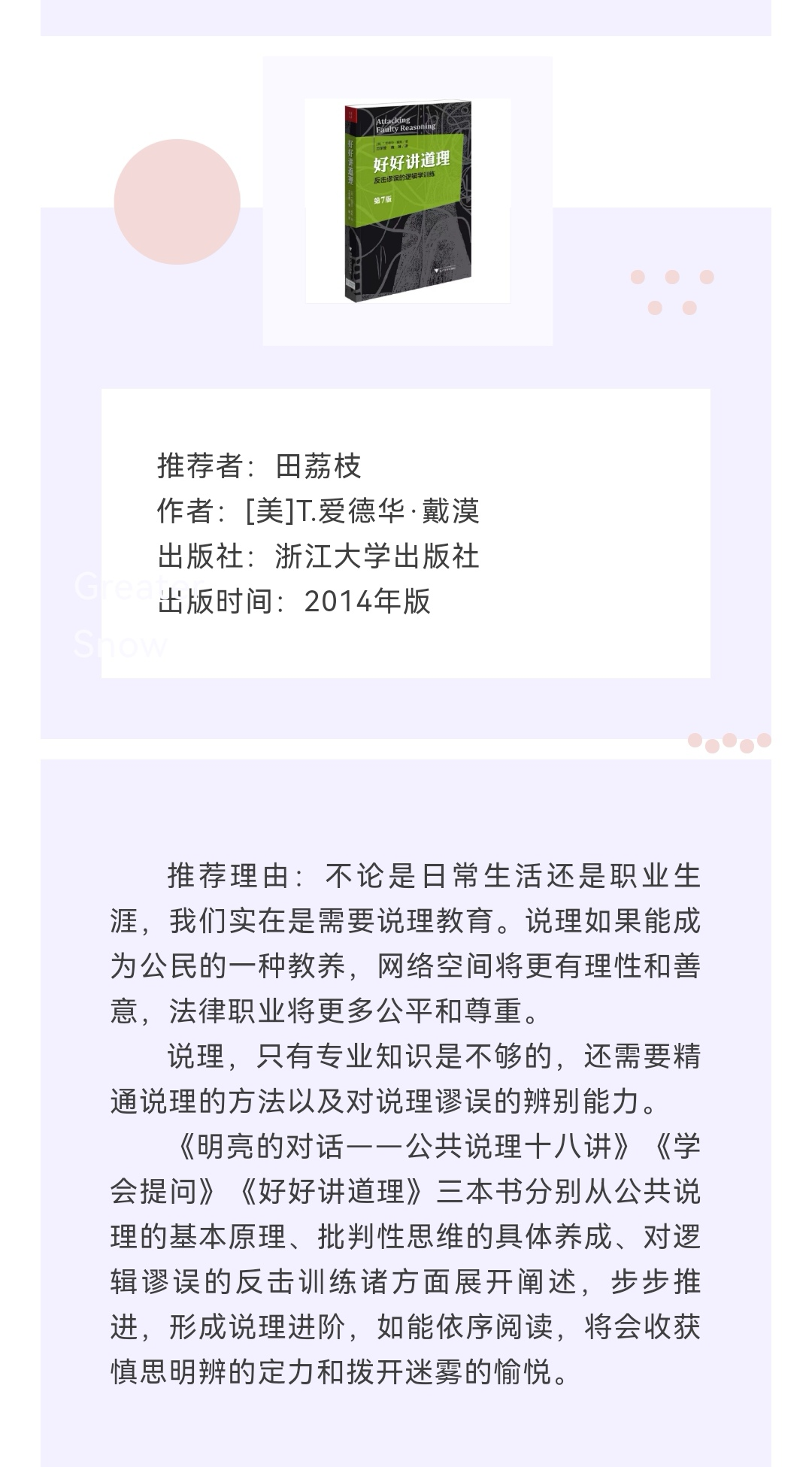 目前,第一期书单已根据老师们的推荐整理发布,共有六位老师推荐了八本书籍。其中,段君尚老师推荐《致年轻律师的信》一书,希望此书能指引年轻学子在人生岔路口走好自己的路;胡乃馨老师推荐《所有权的终极——数字时代的财产保护》一书,帮助同学们了解数字经济创新背后权利义务关系的实质性变化;黄庆余老师推荐《产权、激励与公司治理》一书,希望同学们通过这本书对公司治理结构有深入了解;孙康老师推荐《重新认识中国法律史》一书,认为该书有助于拓宽学生学习中国法制史的视野;田荔枝老师推荐《明亮的对话——公共说理十八讲》《学会提问》《好好讲道理》等书,希望学生借此掌握精通说理的方法、提高对说理谬误的辨别能力;周文章老师推荐《割据的逻辑:中国法律服务市场的生态分析》一书,认为该书既有理论的高度,也有实证的精度和可读性,是中国法律社会学的典范之作。