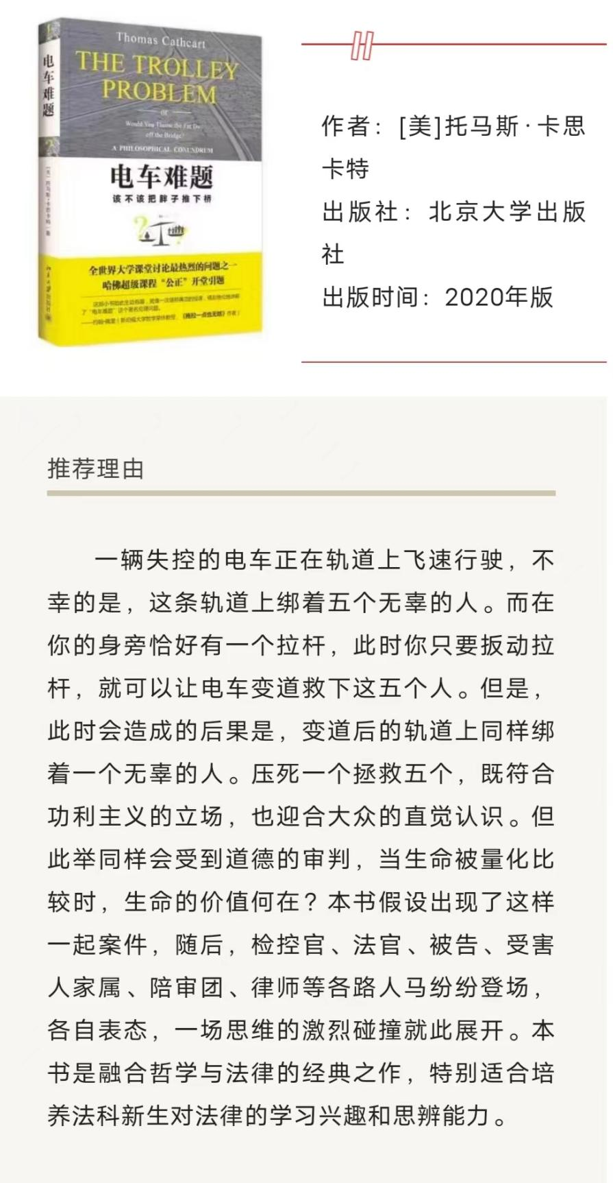 刘建臣老师推荐《洞穴奇案》,希望法科新生能在愉悦的阅读体验中思考法哲学的经典议题;推荐《电车难题》一书,认为此书是融合哲学与法律的经典之作,适合培养法科新生的思辨能力;推荐《法的门前》一书,希望能借助此书引发同学们对于法律价值的思考。
