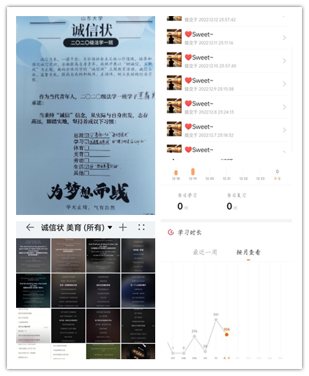 本次“诚信状”主题教育充分发挥学生主体作用,由各班级根据同学特点自主制定活动方案并设计状纸,以21天为限,号召同学们连续完成某项具体任务,以养成良好的学习生活习惯。活动开始后,同学们积极签署诚信状,认真执行设定的任务,内容包括学党史、背法条、记单词、大扫除、体育锻炼、欣赏名曲、光盘行动等,并通过app截图、拍照打卡、群汇报等方式记录参与过程。活动结束后,同学们积极对活动进行总结,并记录自己的心得体会。学院后续将评选出本次活动的先进个人进行表彰,树立典型并带动示范,突出活动引领性。