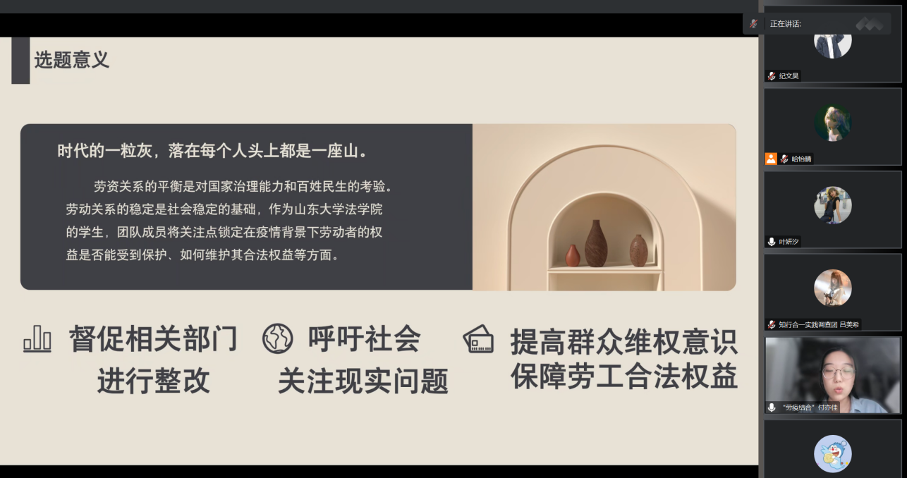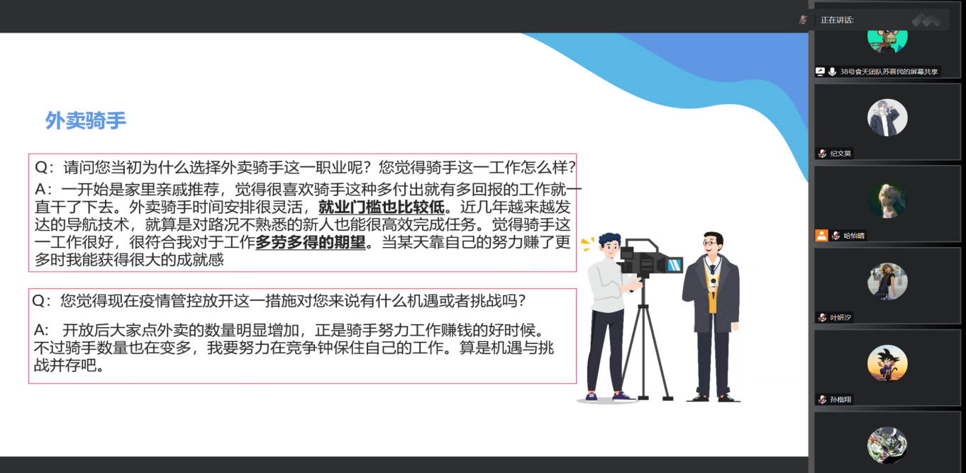 在主持人介绍规则后,答辩会正式开始。参加本次答辩会的共有44支团队,各团队负责人按照抽签顺序依次共享屏幕,结合PPT进行讲解、展示自己所在团队通过调研等方式取得的丰硕成果。