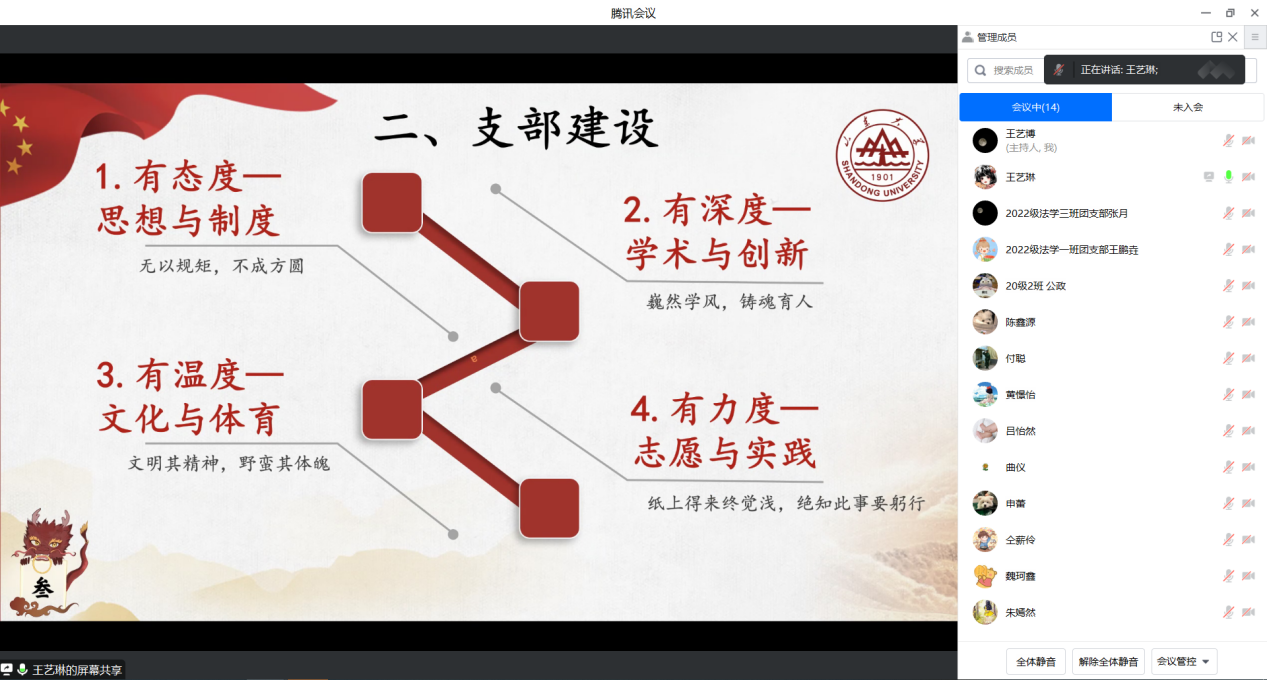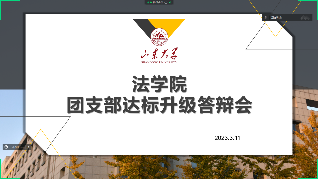 为切实加强基层团支部的组织建设,全面活跃基层团支部工作,3月11日,金沙集团1862cc成色团支部达标升级答辩会在线上举行。金沙集团1862cc成色团委书记曲仪,研究生辅导员吕怡然,本科生辅导员付聪、黄憬怡担任评委。