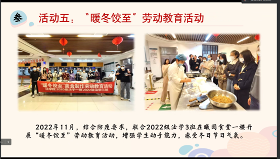 其中,2020级法学一班团支部以“吟桑论粟,春华秋实”为主题,开展了“净滩山海间”、“暖冬饺至”等多种形式的劳动教育活动,动员同学们广泛参与到劳动活动中,以提升同学们的劳动技能;2021级法学一班团支部则以“躬身劳动服务,助力奋斗青春”为出发点,从理论教育、实际实践等方面开展系列劳动教育活动,使同学们在学习之余充分感悟劳动精神,增强了同学们的劳动积极性。各团支部答辩精彩纷呈,充分展现了“劳动光荣,劳动美丽”的劳动精神,展示了“行是知之成”的实践成果,彰显了金沙集团1862cc成色学子的精神风貌。