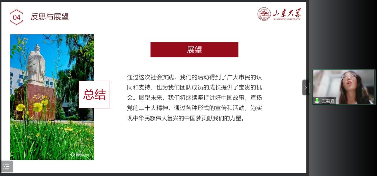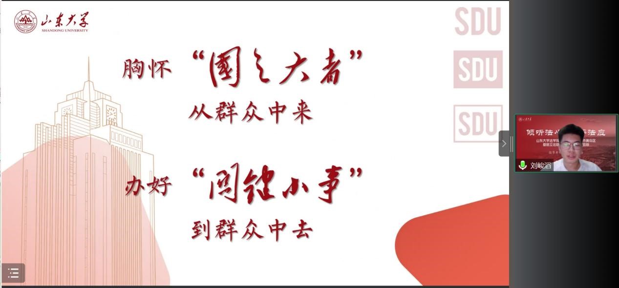 在主持人介绍规则后,答辩会正式开始。本次答辩主要围绕着各支代表队在社会实践的所作所为、所感所悟展开,共有38支队伍参与答辩。各团队代表同学依次进行社会实践项目总结,在3分钟的PPT展示过程中,同学们清晰高效地阐述本团队的实践目的、实践过程以及最后的总结展望,展现了山东大学法学青年积极投身社会实践的风采。