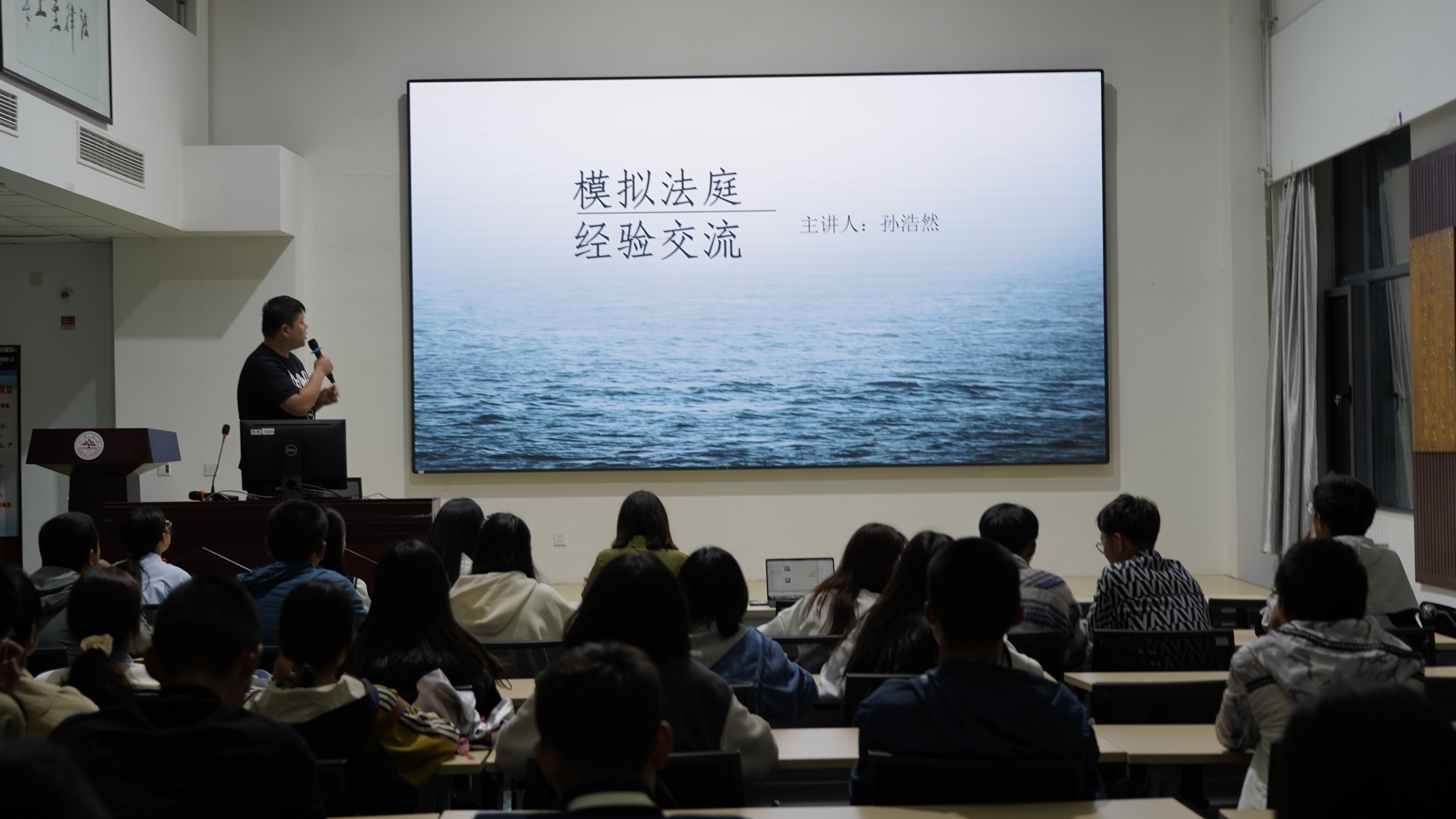 2019级本科生孙浩然在学术竞赛方面进行分享。孙浩然先对模拟法庭赛事项目及我校取得的优异成绩进行了介绍,接着讲述了模拟法庭必备的技能和素质以及自己参与模拟法庭的收获。