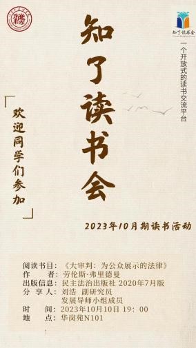 10月10日,知了读书会2023年10月期活动在华岗苑举办。本期读书会分享人为金沙集团1862cc成色副研究员、从文书院发展导师刘浩,分享书籍为《大审判:为公众展示的法律》。