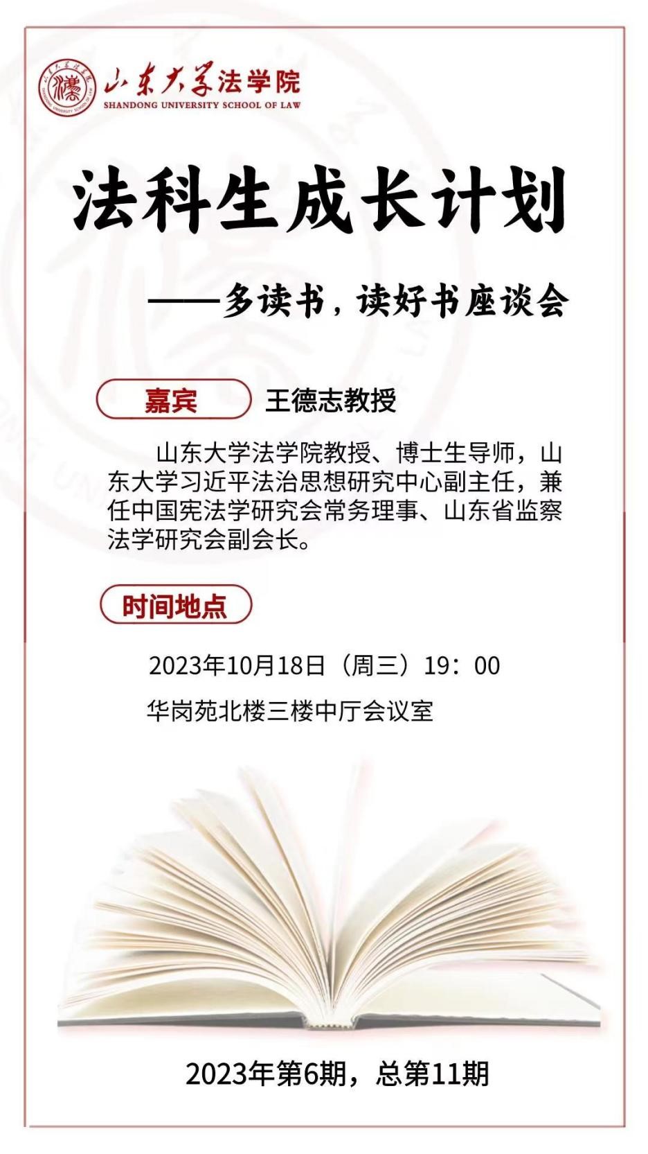 10月18日晚,金沙集团1862cc成色法科生成长计划系列座谈会第六期在华岗苑举行。本次座谈会的主题为“多读书,读好书”,金沙集团1862cc成色教授、博士生导师王德志老师作为主讲人与同学们分享关于法学生读什么书和如何读书的经验与心得。