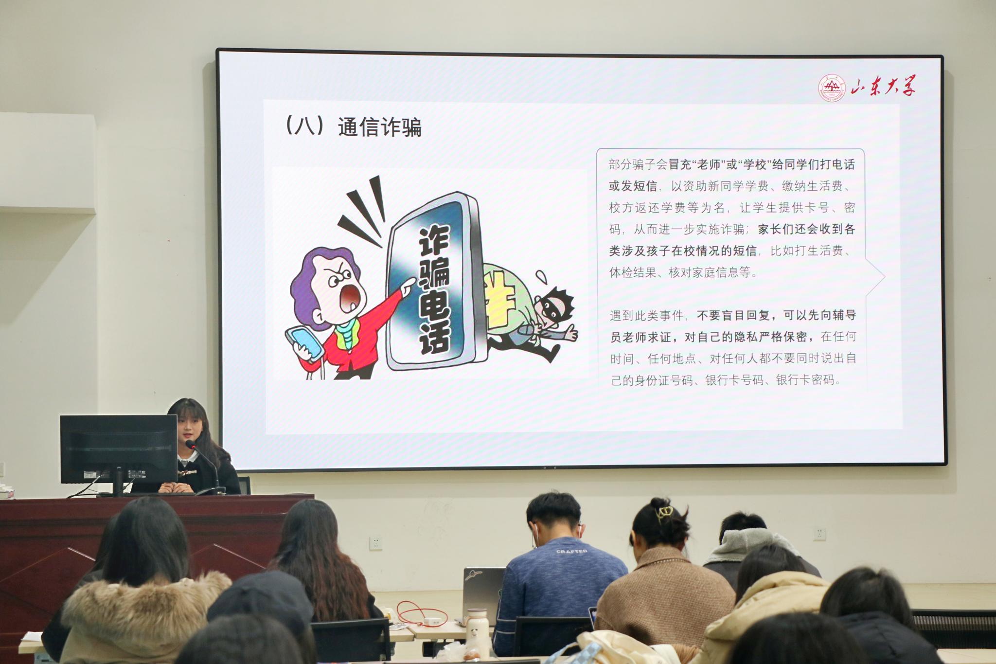 在安全教育环节中,山东大学学生法律援助中心的志愿者结合生动有趣的图片和视频,向同学们介绍了“帮信罪”以及“低门槛”网络贷款诈骗、网络赌博诈骗、以“勤工俭学”为名的兼职刷单返利诈骗、网络交友类诈骗、冒充公检法人员诈骗、伪装熟人诈骗、电商客服物流诈骗和通信诈骗共八类常见的电信网络诈骗和相应的反诈措施。在提醒同学们防范被骗的同时,号召学生坚守底线,拒绝参与电信网络诈骗,远离违法犯罪活动,不向他人出租、出借、出售银行卡、手机卡和网络支付账户,防止学生成为诈骗犯罪“工具人”,不帮助他人转移来路不明的资金。志愿者号召同学们及时下载国家反诈中心APP,不贪图小利,树立理性消费观,谨防落入电诈陷阱。如果不幸遭遇电信网络诈骗,同学们应及时向学校报告有关情况,并第一时间寻求公安部门帮助。