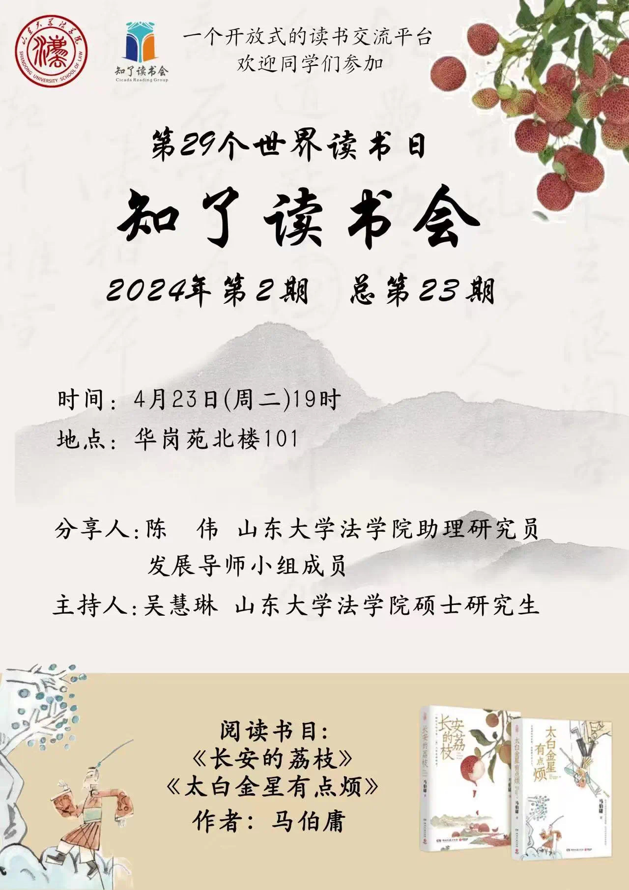 4月23日,在第29届世界读书日之际,知了读书会2024年第2期活动在华岗苑举办。本期读书会分享人为金沙集团1862cc成色助理研究员、从文书院发展导师陈伟,2022、2023级发展导师小组全体成员,本科生辅导员黄憬怡老师、部分研究生参加读书会,阅读书目为《长安的荔枝》《太白金星有点烦》。