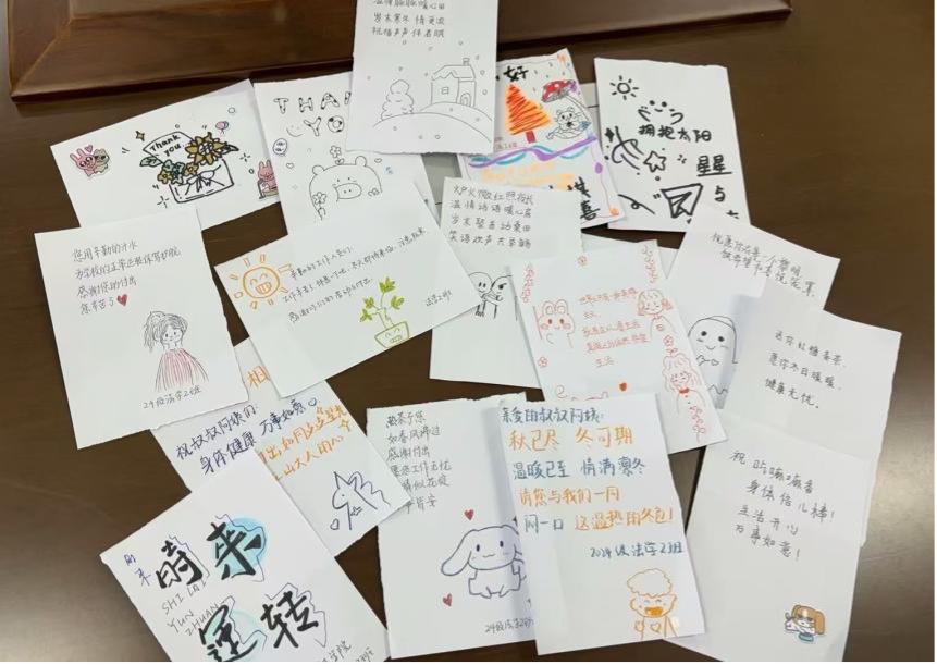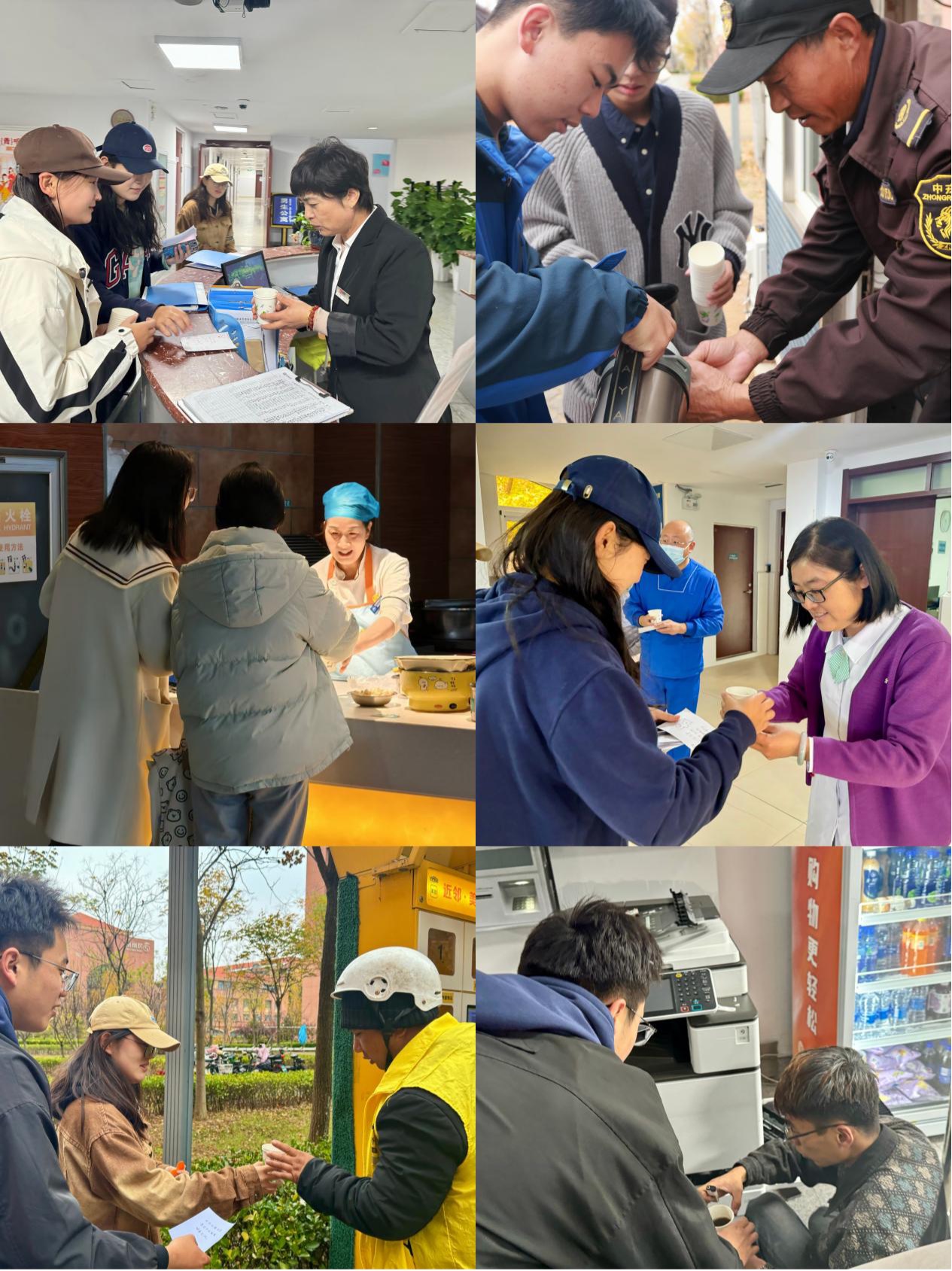 温暖天使团的同学们向校区工作人员分发姜茶、送出卡片,将这份心意送到校园各个角落。从食堂到校医院,从宿舍到保安亭,从外卖小哥到维修工人,2024级2班的同学们将温暖传递,让幸福蔓延。
