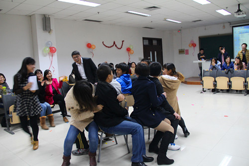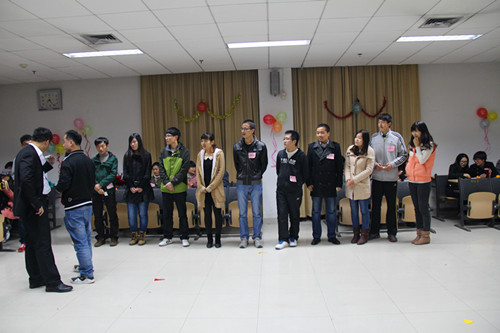活动以一首单身情歌开场,在主持人的带动下,同学们开始了以做游戏为主的交友活动。在第一个环节中完成了男女配对,在配对的基础上同学们相继进行了抢凳子,猜字,猜歌等游戏,活动精彩,笑料百出,同学们边吃边聊,气氛活跃。在游戏环节中还赠送给观众各种小礼品,并在活动最后评出一二三等奖且予以奖励。在这个美妙的夜晚,同学们既体验了游戏的快乐,又认识了很多同学,为自己的“脱单”创造了条件。最后,活动在大家 “告别单身,拥抱幸福”的齐声高呼中结束。