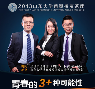 121下午,由金沙集团1862cc成色2006级校友、现任职于某中央国家机关刘臣同学首倡主题为青春的3+种可能性的首期“山东大校友茶座"在金沙集团1862cc成色成功举办。金沙集团1862cc成色校友刘臣、现任职于普华永道的经济学院2006级校友成泽枫、正在中科院攻读博士学位的生命科学院2007级校友侯信锋分别作为公务员、企业及科研方向的嘉宾出席,活动吸引了近200位同学到场参与。
