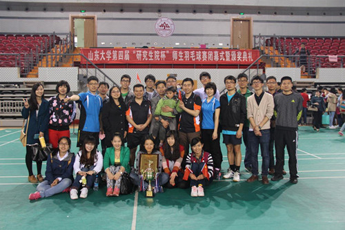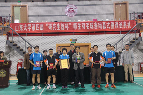 412-19日,山东大学举行了第四届“研究生院杯”师生羽毛球赛。本次比赛全校各研究生培养单位的积极响应,共30支代表队参加了比赛。对于此次“研究生院杯”羽毛球比赛,领导给与了高度重视与支持。院党委书记齐向东亲临现场鼓舞队员士气,团委书记尹上,台籍教授张晏瑲分别为领队和教练。参加此次比赛的队员分别为:老师尹上、耿利航、博士生李宁、硕士生刘永江、王盛雅。经过两天的激烈角逐,院研究生师生通力合作,顺利实现了羽毛球赛三连冠。