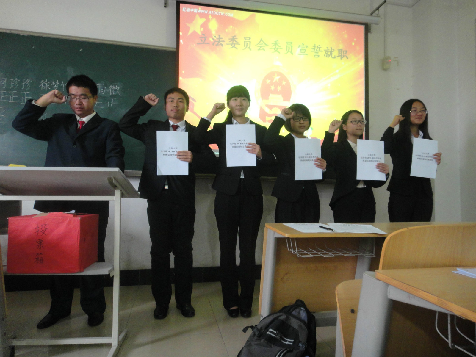 随后两名立法监督委员一起上台宣誓就职,由团支书颁发立法监督委员证。六名立法委员王竹筠、陈子雨、赵秀洁、任予杉、梁尚宁、韩尚宜也上台庄严宣誓就职,班长为其颁发立法委员证。本次立法委员的产生是通过层层面试进行选拔的,并有群众代表全程监督,宣传委员全程跟踪报道,保证了委员产生的合理性和透明性。委员宣誓就职完毕,刘显楷宣布班级立法活动正式启动。