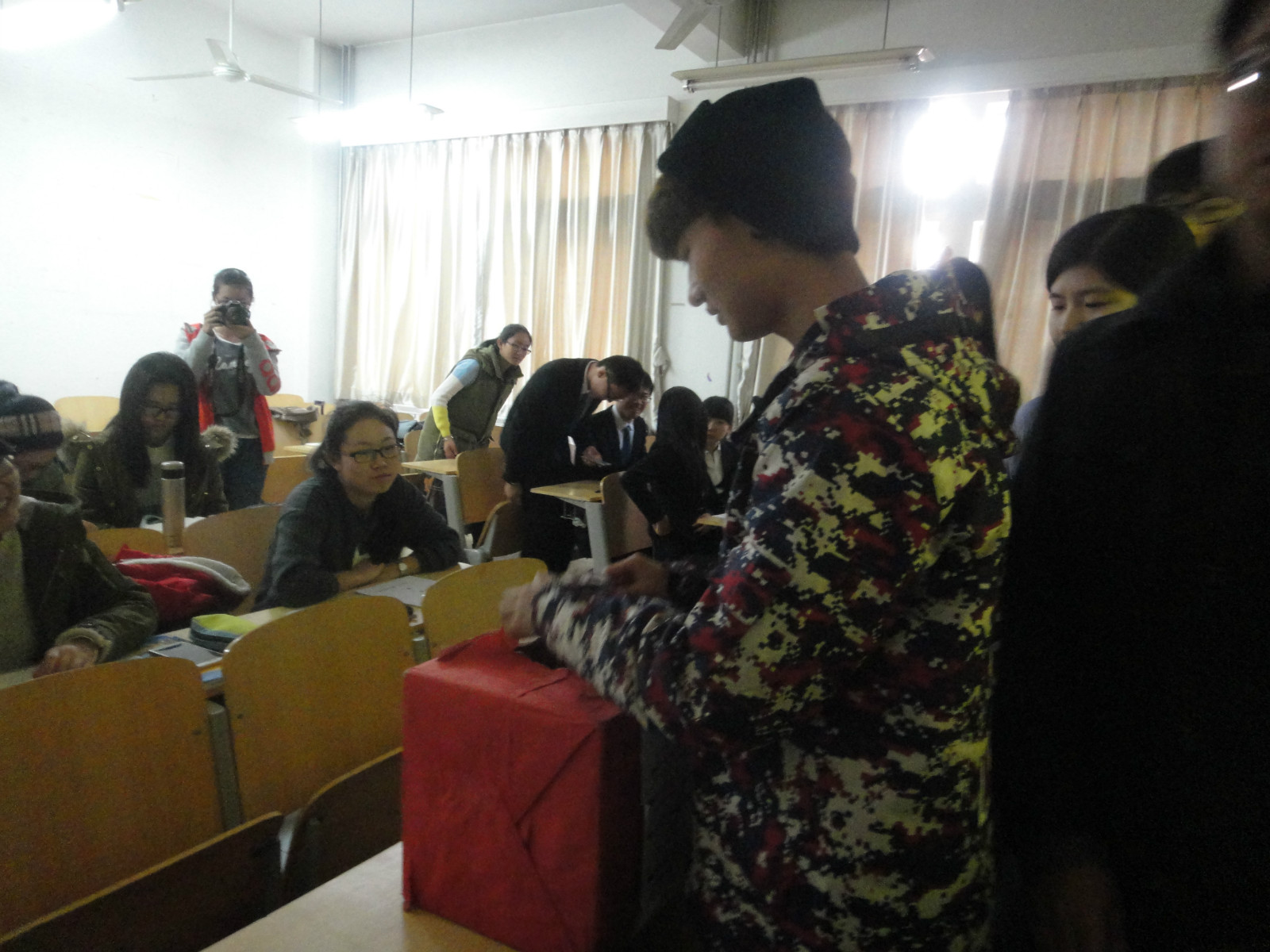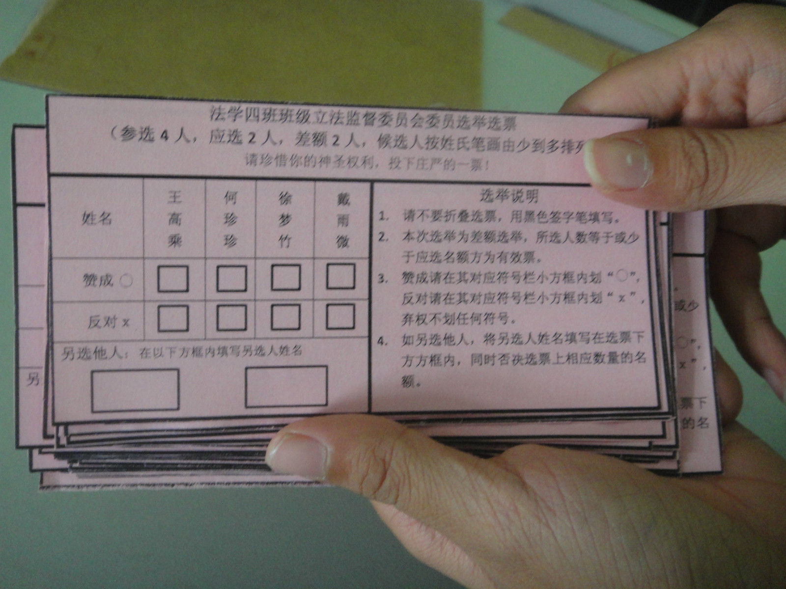 上,首先由班长刘显楷与团支书黄春林先后致辞,用真诚恳切的话语向同学们介绍了本次活动的意义,呼吁同学们积极参与。接下来进行立法监督委员会委员选举,在四名候选人依次上台进行演讲后,会议通过差额选举、公开唱票及统票的透明流程最终确定了监督委员名单,何珍珍、王高乘同学当选。其中最值得一提的,是选举流程的正规性,韩尚宜同学参照全国人大代表的选举制定了此次流程,并与梁尚宁同学一道制作了正式选票,这也大大提高了同学对本次班级立法的关注与重视,同时也彰显了本次立法活动的严肃性与规范性。