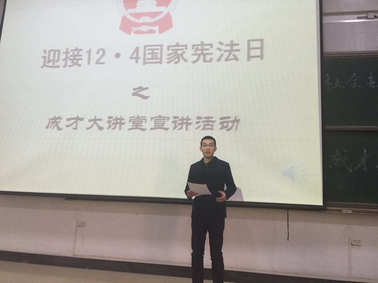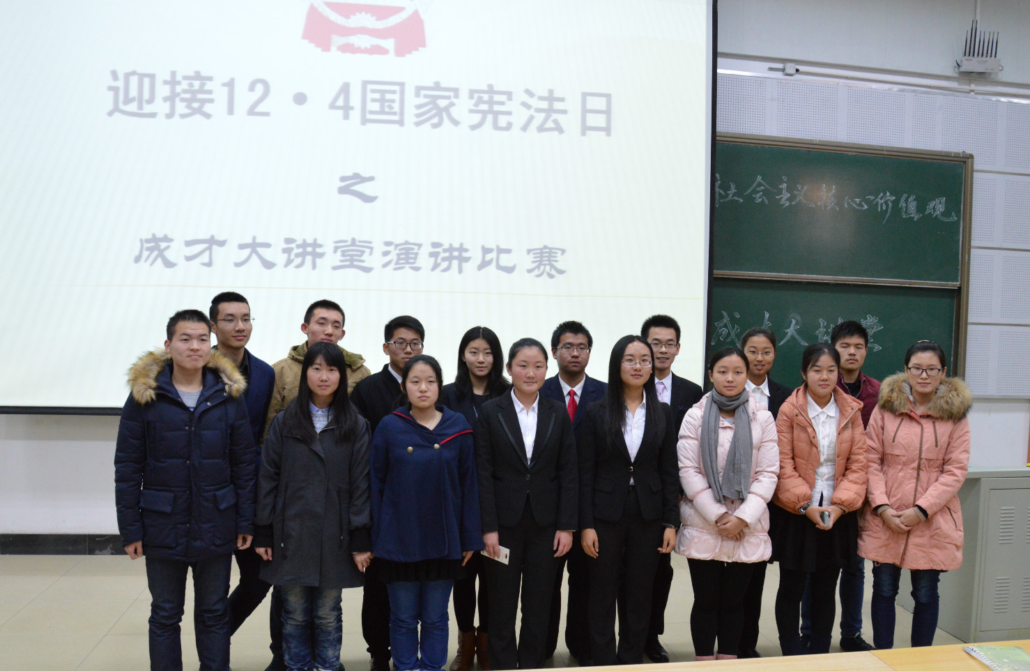 123日下午,以“迎接12·4国家宪法日”与“弘扬和践行社会主义核心价值观”为主题的成才大讲堂活动在兴隆山校区讲学堂203举行。本次活动得到了金沙集团1862cc成色2015级全体本科新生的积极参与,2015级新生辅导员于沂仟,辅导员助理宋义正出席本次活动并担任评委。