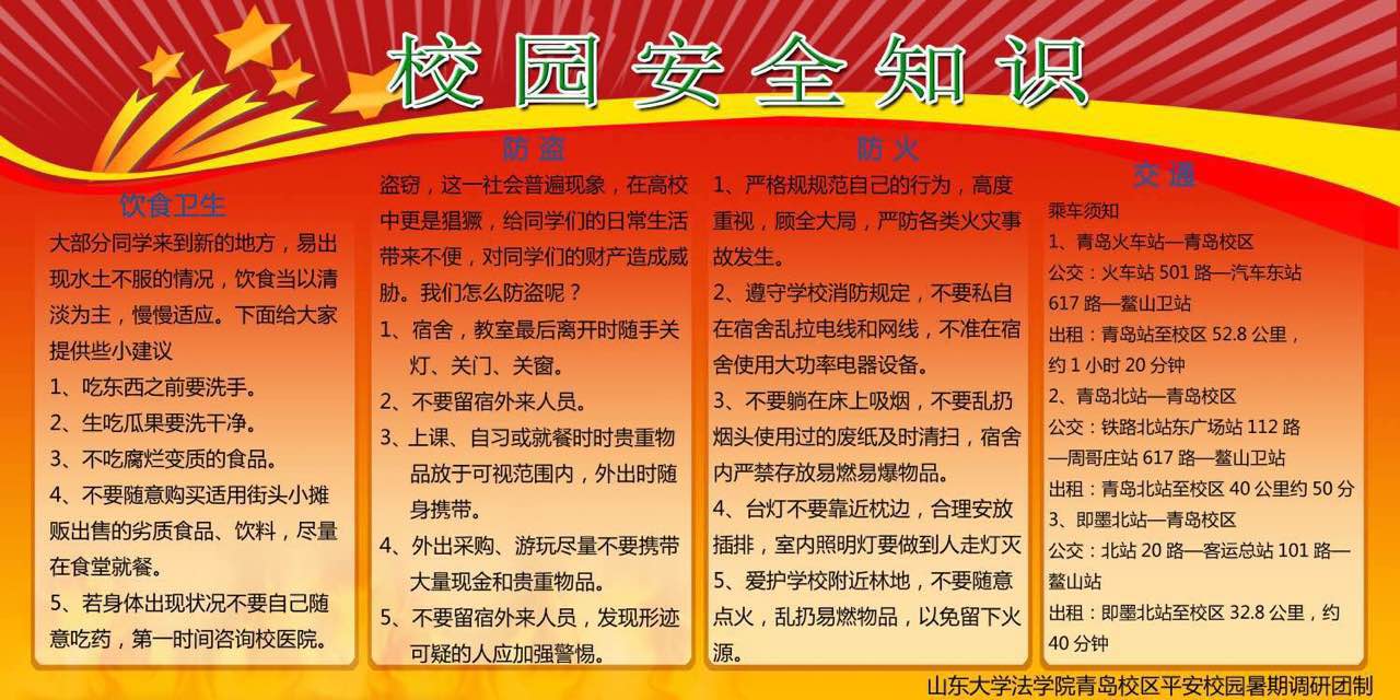 9月17日至9月18日,平安校园暑期调研团根据第一阶段的成果,团队成员携带相关的宣传及调查材料,由金沙集团1862cc成色研究生辅导员田蕙老师带队,对青岛校区进行了第二次实践调研。