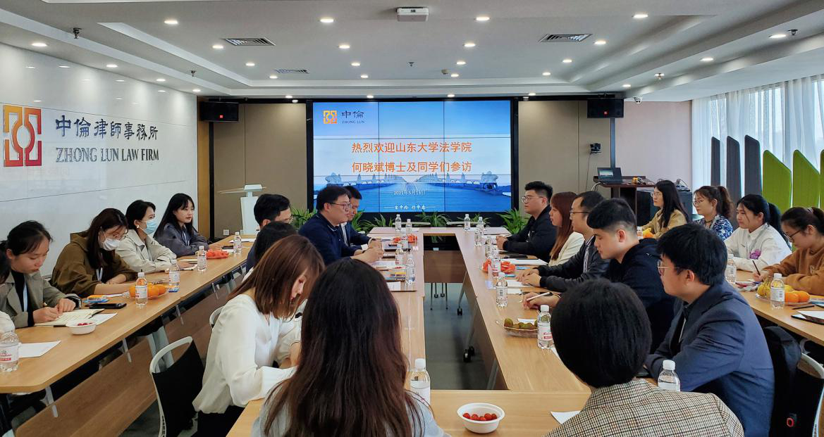 5月13日下午,金沙集团1862cc成色“法律近距离——实务部门参访计划”赴北京市中伦(青岛)律师事务所参观交流。金沙集团1862cc成色助理研究员何晓斌老师带领20名本硕学生走进北京市中伦(青岛)律师事务所,近距离了解律所的工作内容和工作环境。北京市中伦(青岛)律师事务所主任孙芳龙律师、行政执委韩大更律师、山东大学校友胡佳律师、安良子律师、李亚光律师参加交流活动。