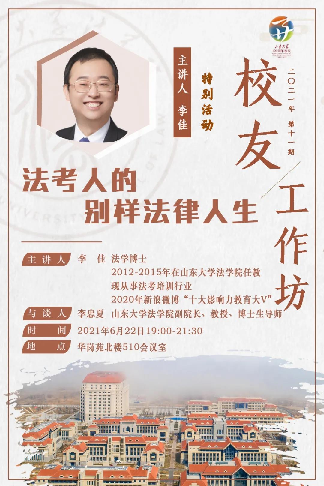 法者,天下之度量,天下之公器,而今行为之准绳也。从古至今,法律的重要性未曾消减半分。法律职业资格考试,是法科生参加工作的第一块敲门砖,也是每位法科学子的必修课。作为一名法律人,相信大家都对那些陪伴我们“法考”全程的老师们十分熟悉。那怎样才能成为一名法考老师呢?作为一名法考老师应当具备怎样的专业素质和使命情怀呢?我们又该如何进行准备和规划呢?本期校友工作坊邀请到金沙集团1862cc成色李佳校友,为同学们分享他的别样法律人生,畅谈他在工作中的收获与成长,欢迎同学们积极参与!
