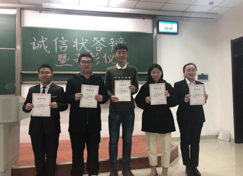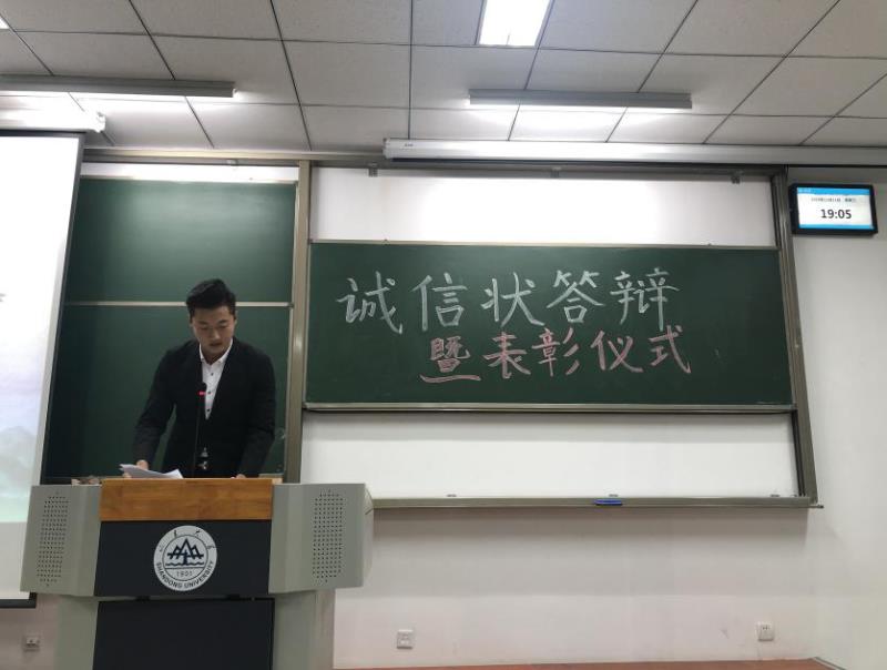 2019年12月11日晚,金沙集团1862cc成色“诚信状”主题活动答辩暨表彰大会在振声苑E106教室举行,由金沙集团1862cc成色2019级本科生张文腾主持。