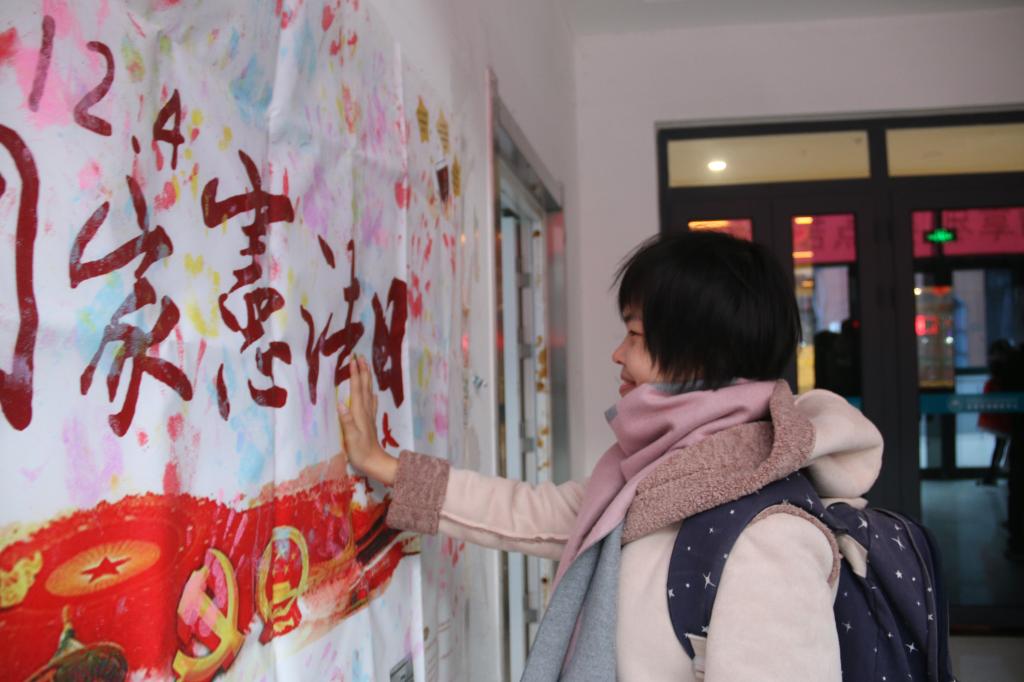 本次宪法一日行活动虽然受到天气状况限制,但雨水并未浇灭同学们的热情,同学们积极参与简单有趣的宪法知识问答活动。在宪法日宣传墙签名、按手印、在 KT 板拍照并将照片发到朋友圈或空间、集攒兑零食大礼包、沙画瓶等礼品、抽奖等各种趣味环节也为宪法一日行活动增添趣味。