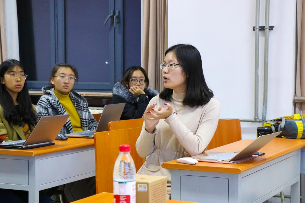 首先韩玮瑶同学和李安华同学为在场同学介绍了自己参与过的“贸仲杯”国际商事仲裁模拟仲裁庭辩论赛和jessup国际法模拟法庭比赛的经验。他们从英文模拟法庭的意义、参与比赛的初心和备赛的技巧等几个方面进行了介绍,现场反响热烈。