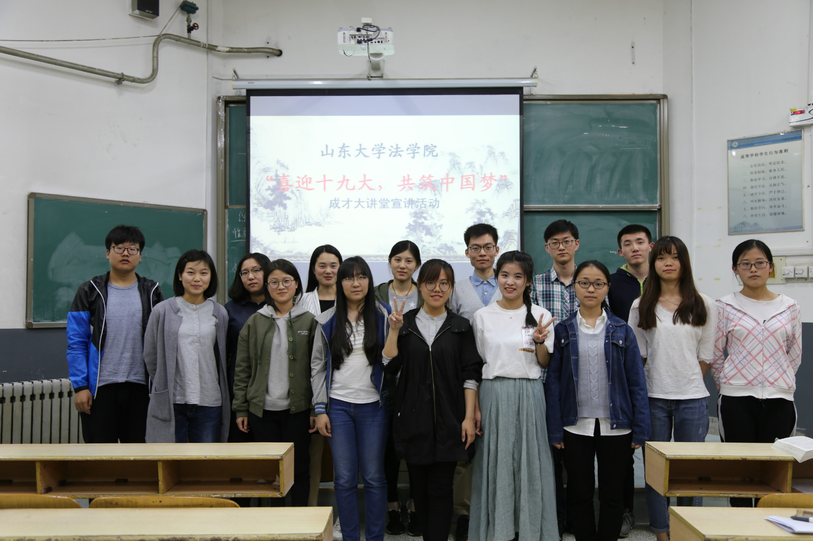 其中,洪家楼校区“成才大讲堂”宣讲活动共有24名同学参与。参加宣讲的同学们分别从“共建共享健康中国”、“文化自信”、“推进社会诚信建设”三个小主题出发,自选切入点进行演讲和PPT展示。同学们对此都做了积极充分的准备,既有理论的宣传又有个人经历的展示,观点各异,想法独特,许多同学在展示演讲主题的同时,不忘联系法学专业的知识与背景,充分展示法律人的逻辑思维以及社会情怀。四期宣讲活动获得老师以及同学们的一致肯定和好评青岛校区“成才大讲堂”宣讲活动紧密围绕“迎接十九大,共筑中国梦”的主题,立足各个角度全方位多方面的对同学们进行了精神的洗礼。演讲主题包括回顾党的十八大以来党政建设取得的伟大成就及丰硕成果,透过钓鱼岛、南海问题及“萨德”事件浅谈理性爱国,回顾党的十八大以来习近平总书记系列讲话,结合近期热播剧《人民的名义》谈党建反腐斗争,更有法英班同学以英文演讲的方式为同学们诠释了社会主义核心价值观。
