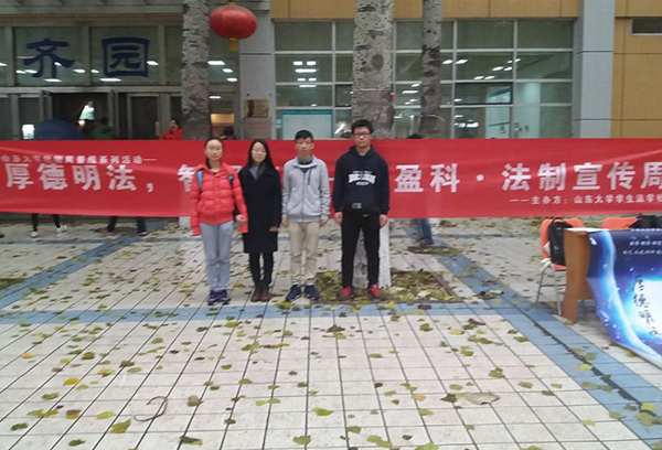 为迎接国家宪法日的到来,普及法律知识,山东大学法学社分别于2016年11月18日、19日在山东大学洪家楼校区、中心校区进行了“厚德明法,智周万物——盈科法制宣传周”的宣传活动,吸引了广大同学前来参加。