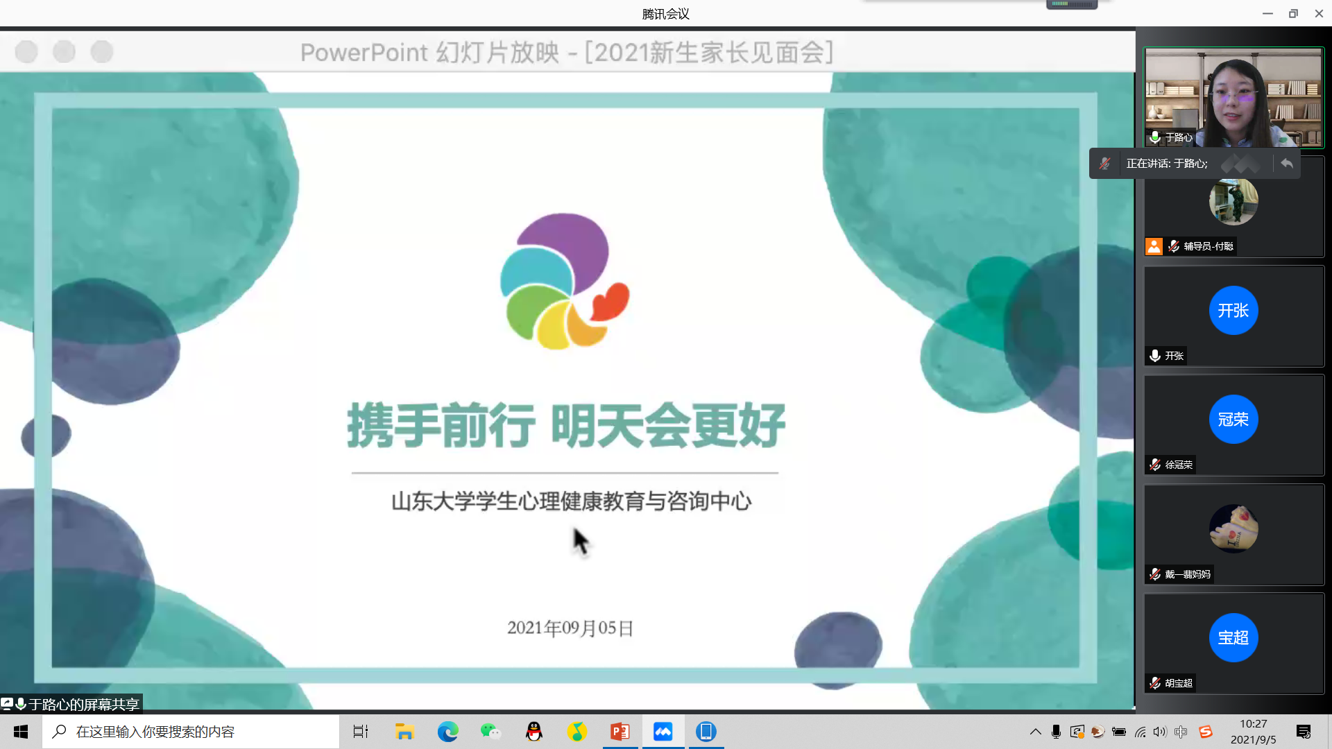 为促成家校合力,增进家长对学校学院和新生入学工作的了解,金沙集团1862cc成色于9月5日在线上召开2021级新生家长见面会。青岛校区学生心理健康教育与咨询中心于路心,金沙集团1862cc成色团委副书记曲仪、教务秘书范毅强、兼职辅导员刘欣和4位朋辈班主任参加会议,2021级本科新生辅导员付聪主持会议。