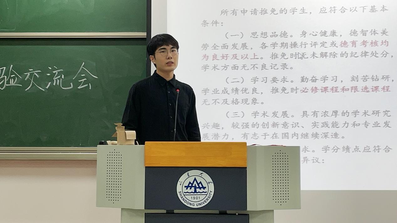 首先进行分享的是蔡可润同学。他就保资与保支的一系列问题进行了细致入微的讲解。蔡可润同学从推免与保资保支政策、申请推免生的基本条件、推免生计划分配办法、具体的保研类型以及相应的推荐办法等方面对保资保支进行了详细的说明。针对具体的选拔方式及程序,他结合自己的经验展开分析,同时提醒同学们做好平日的积累。蔡可润同学一番细致认真的讲解使同学们对保资保支有了初步的了解。
