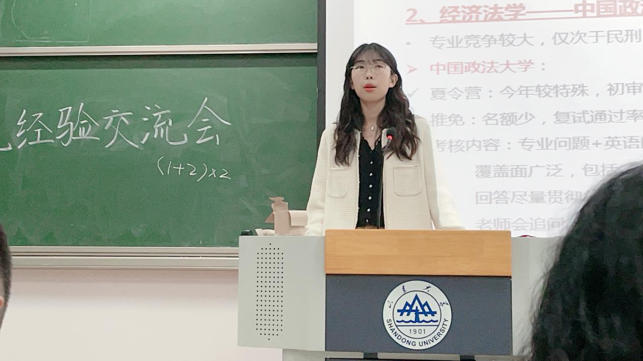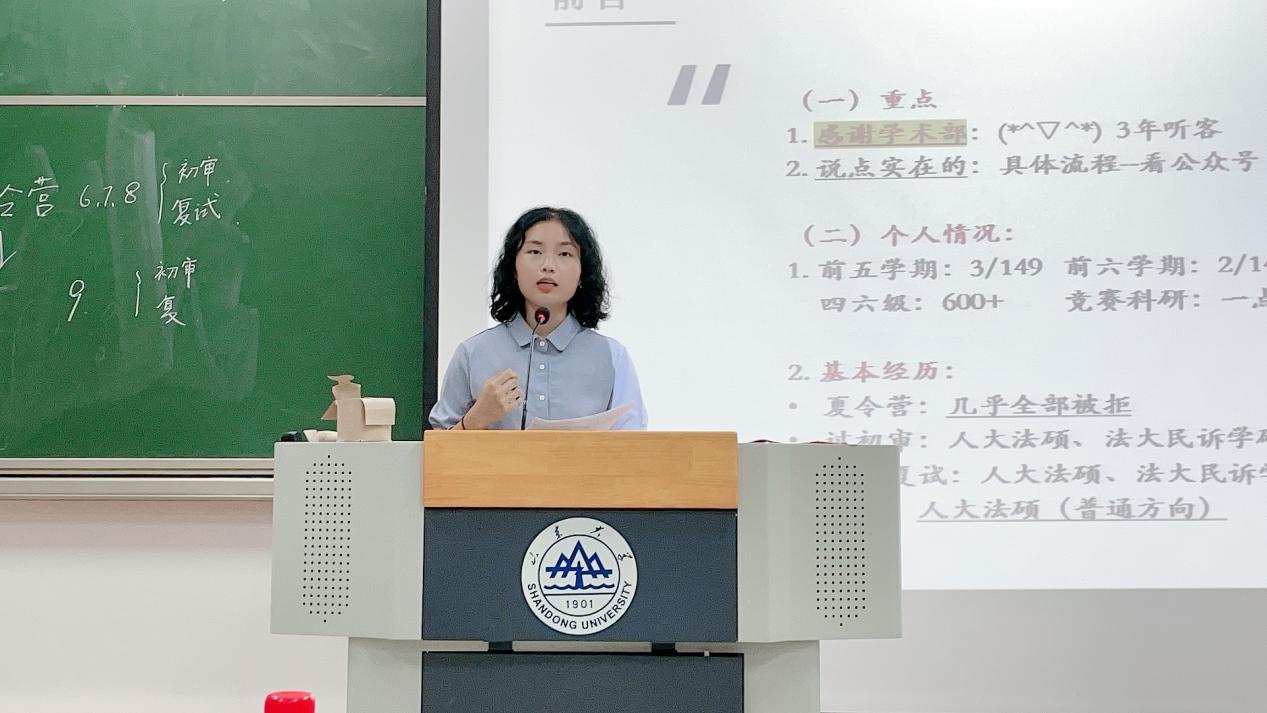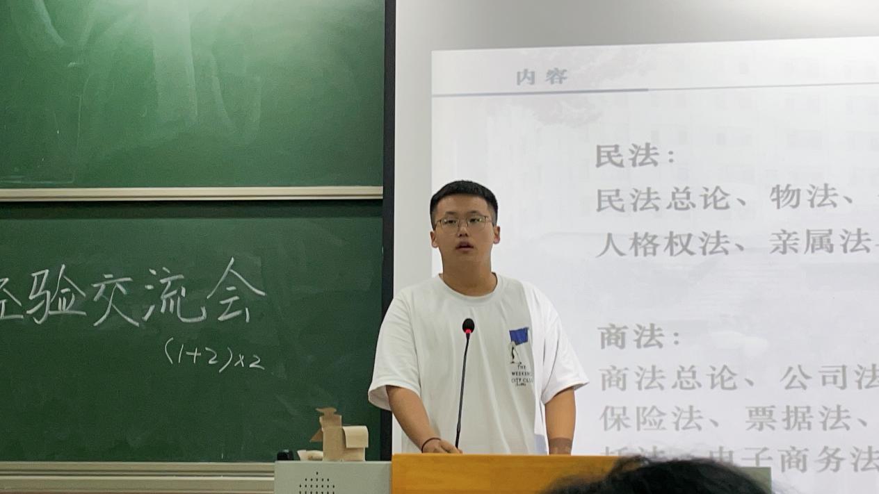 第三位上台交流分享的是廉卫昊同学。他围绕诉讼法学的复习与备考展开交流。首先,他分享了自己选择诉讼法学的原因,这使同学们明白了明确自己专业定位的重要性。在明确了各校录取选拔要求与考查形式的基础上,他以法大和山大为例重点强调了复习进度的把控与资料的准备。最后,他强调了成绩的重要性,并提出在保证成绩的基础上提高其他方面的水平。他的分享使同学们对诉讼法学有了进一步的了解。